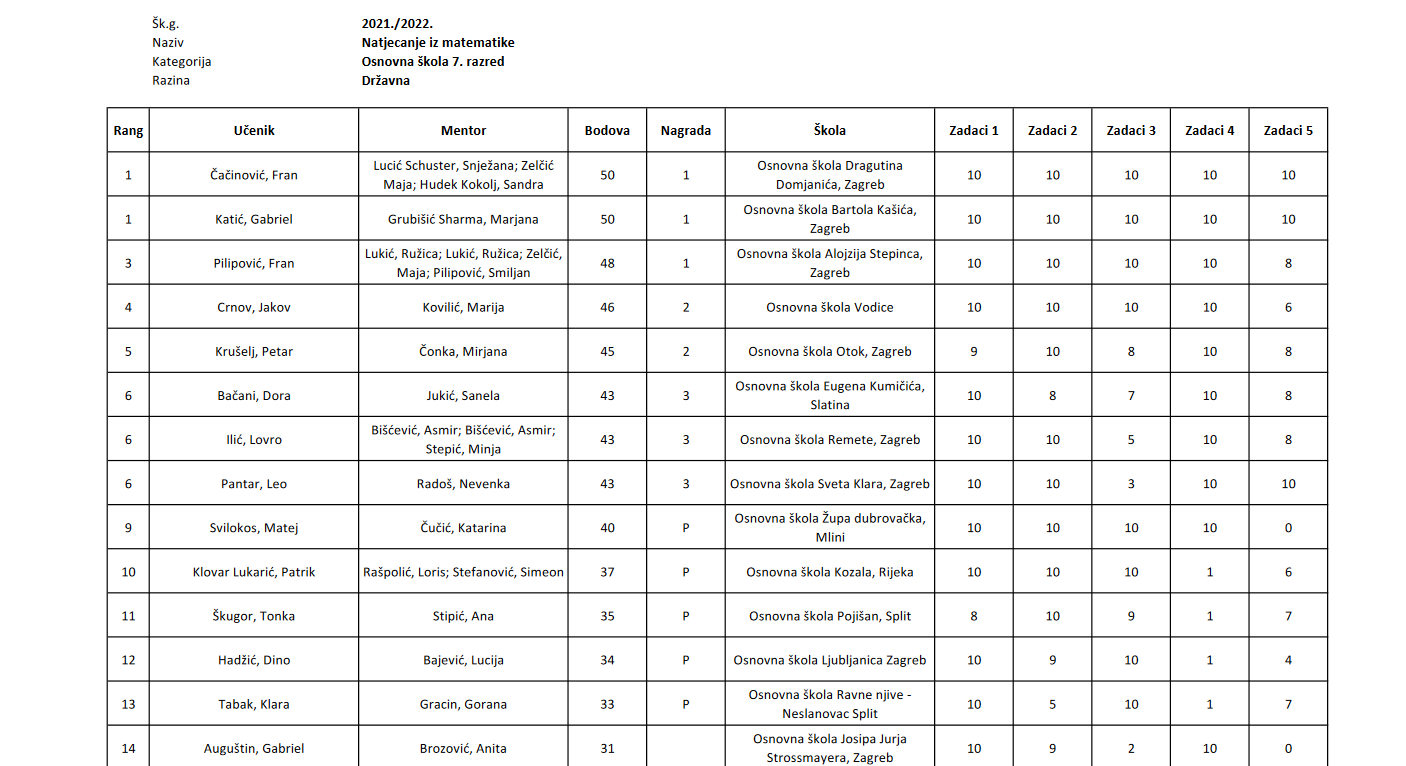 Jakov Crnov, učenik 7.e razreda (mentorica Marija Kovilić) osvojio je četvrto mjesto na državnom natjecanju iz matematike. Domaćin ovogodišnjeg 63. državnog natjecanja koje je održano od 10. do 12. svibnja bila je naša škola, a sudionici su bili smješteni u hotelu Punta. Bravo Jakove!!!!![]()