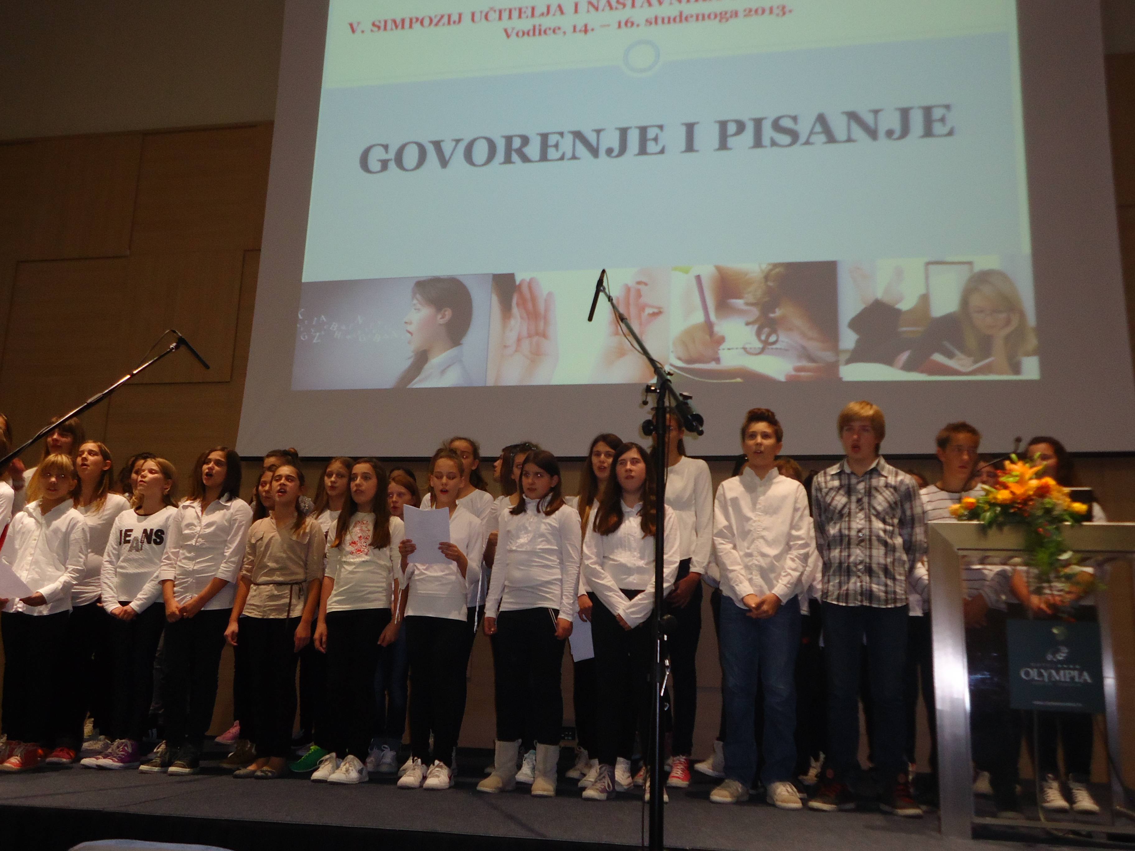 Pjevački zbor pod vodstvom nastavnice Glazbene kulture Vjere Pavić sudjelovao je na svečanom otvaranju V. simpozija učitelja i nastavnika Hrvatskoga jezika. Simpozij je trajao 14. - 16. studenoga 2013. u hotelu " Olimpia". Učitelji i nastavnici osnovnih i srednjih škola pratili su predavanja i radionice na temu: Kompetencija na materinskome jeziku - govorenje i pisanje.