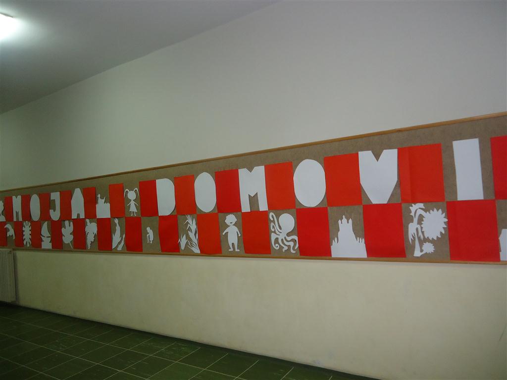 Učenici 7. i 8. razreda s nastavnicom Likovne kulture Nerom Čače u listopadu su oživjeli školski hodnik pred zbornicom veselom izložbom Moja domovina. Složili su igru crvenih i bijelih papira među kojima su tiskana slova MOJA DOMOVINA. Osim riječi izrezali su i likove koji predstavljaju motive iz različitih krajeva Hrvatske. Kao što maslina, galeb, magarac, riba, brod predstavljaju Dalmaciju, tako slike žita i kukuruza predstavljaju Slavoniju. Pano uspješno dočarava bogatstvo hrvatske prirode. Prošećite hodnikom. Uživajte!