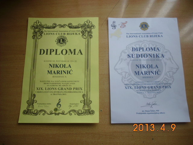 Bitno je istaknuti da je Nikola dobio i nagradu LIONS GRAND PRIX natjecanja koju mu je u Rijeci osobno uručio Guverner Lions cluba Hrvatska.