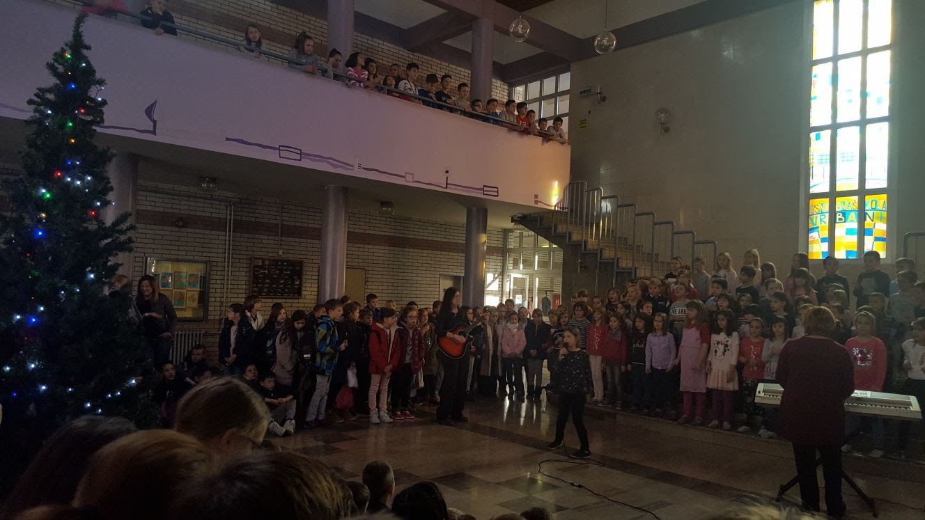 Na zvuk zvona za kraj sata, učenici razredne nastave uzbuđeno su se okupili u predvorje škole i nasmijanih lica dočekali svetog Nikolu pjesmom i recitacijama pod budnim okom vjeroučiteljice Margarete.