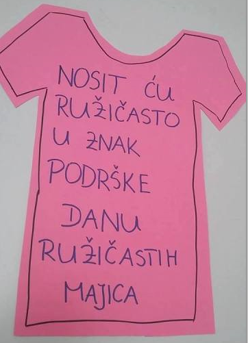 I na našoj će se Školi Dan ružičastih majica obilježiti i to u srijedu 27.2.2019. tako što će svaki razredni odjel izrezati od ružičastog papira konturu ružičaste majice (jednu ili više) te na njoj upisati razredni slogan, razredno pravilo, protiv nasilnog ponašanja među vršnjacima te će ga zalijepiti s vanjske strane vrata učionice (ili na pano u hodniku, ili na zid kraj učionice s vanjske strane).