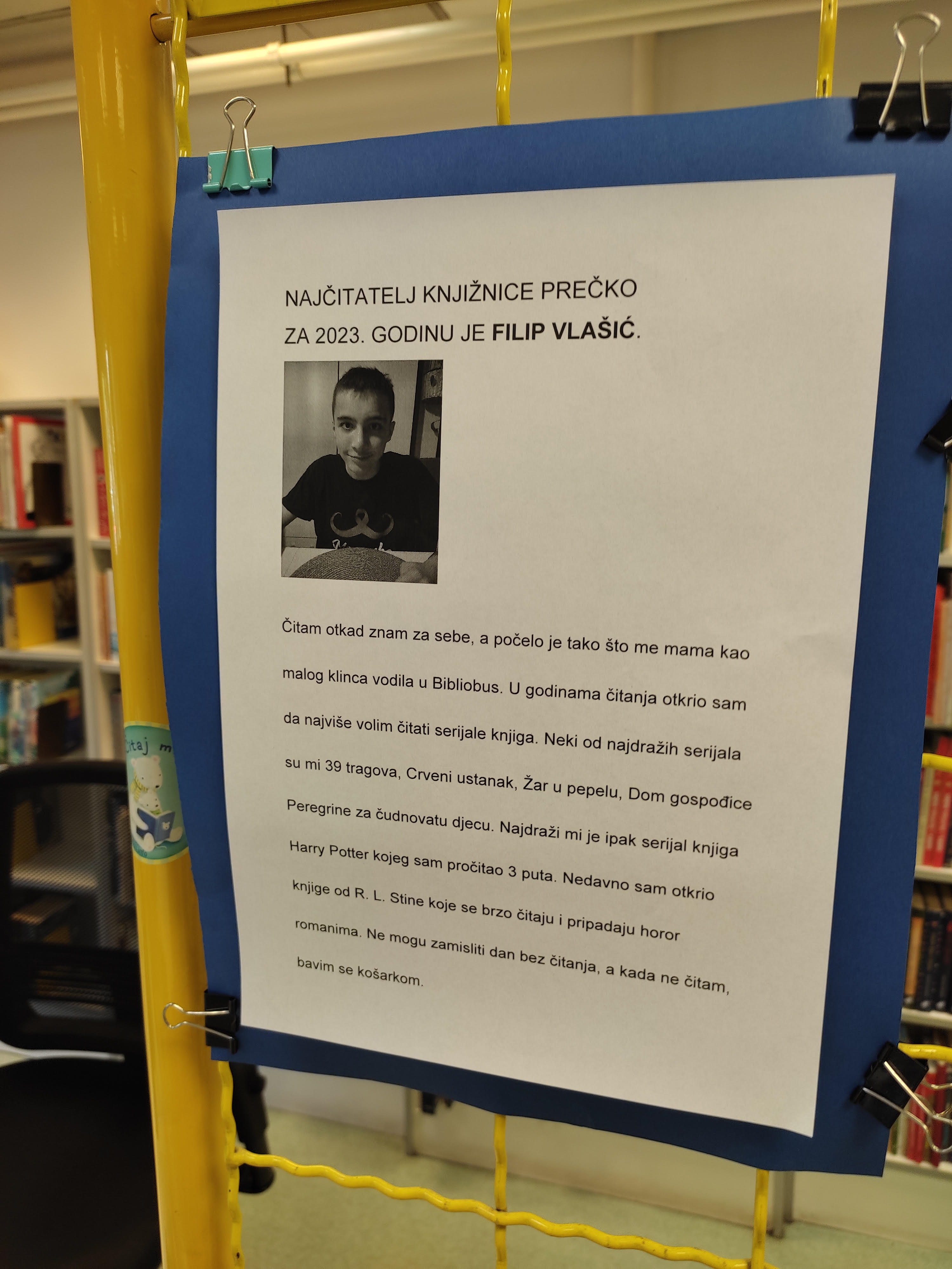 Lijapa vijest nam je stigla iz Knjižnice Prečko. Naš učenik sedmog razreda, Filip Vlašić proglašem je NajČitačem za 2023. godinu.