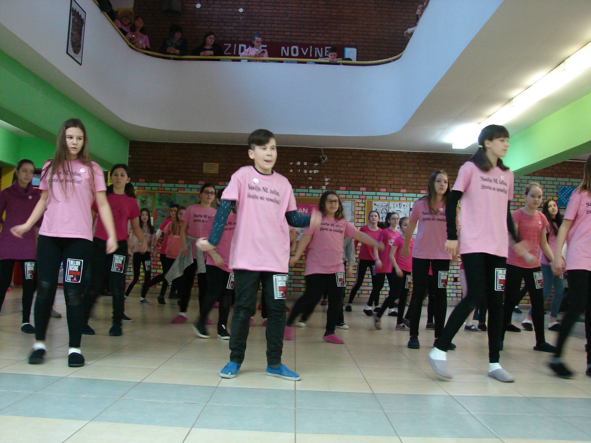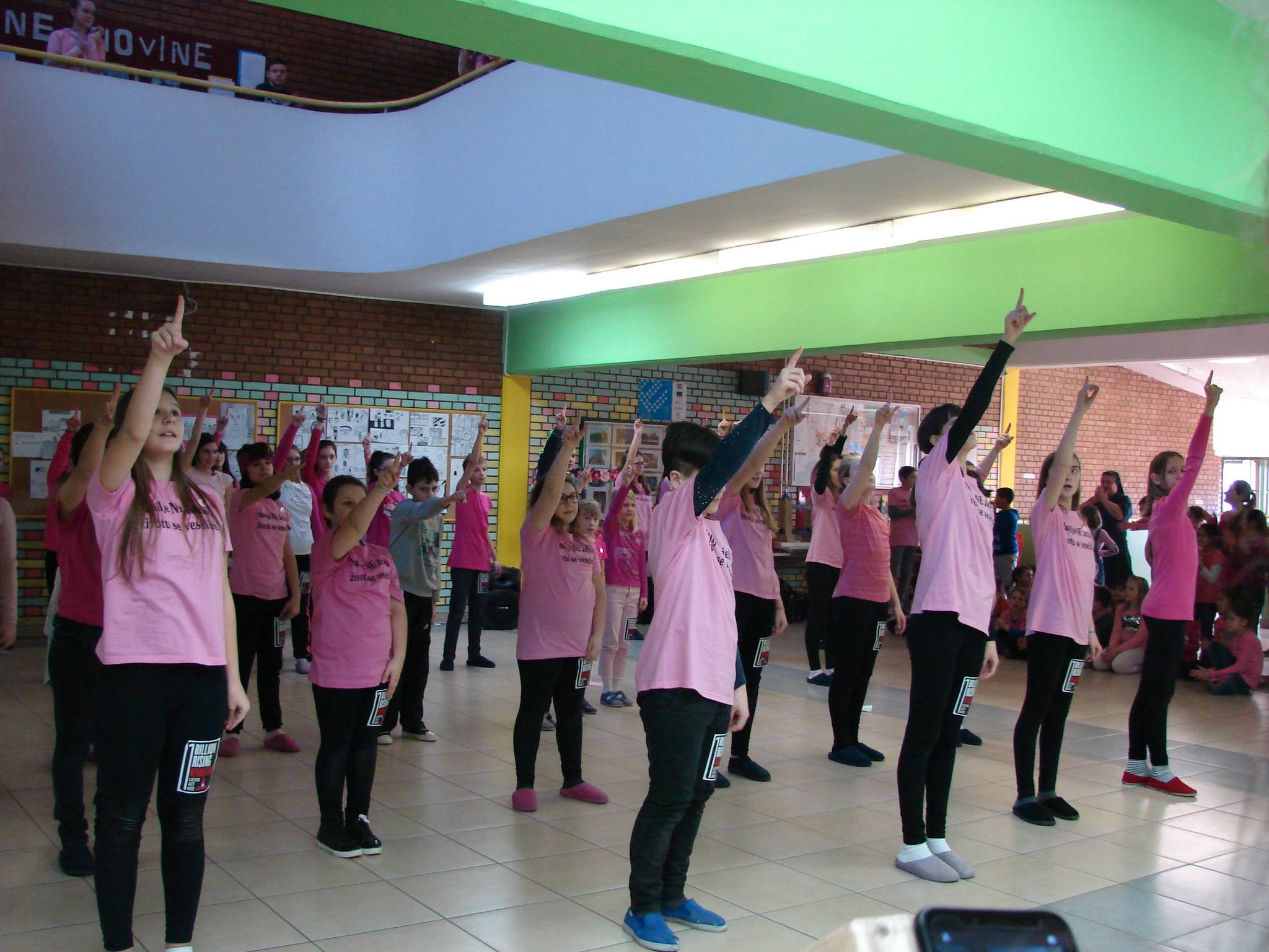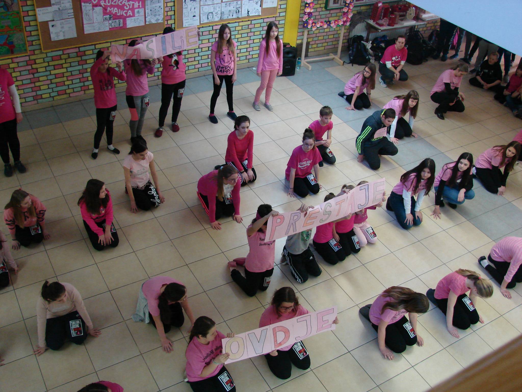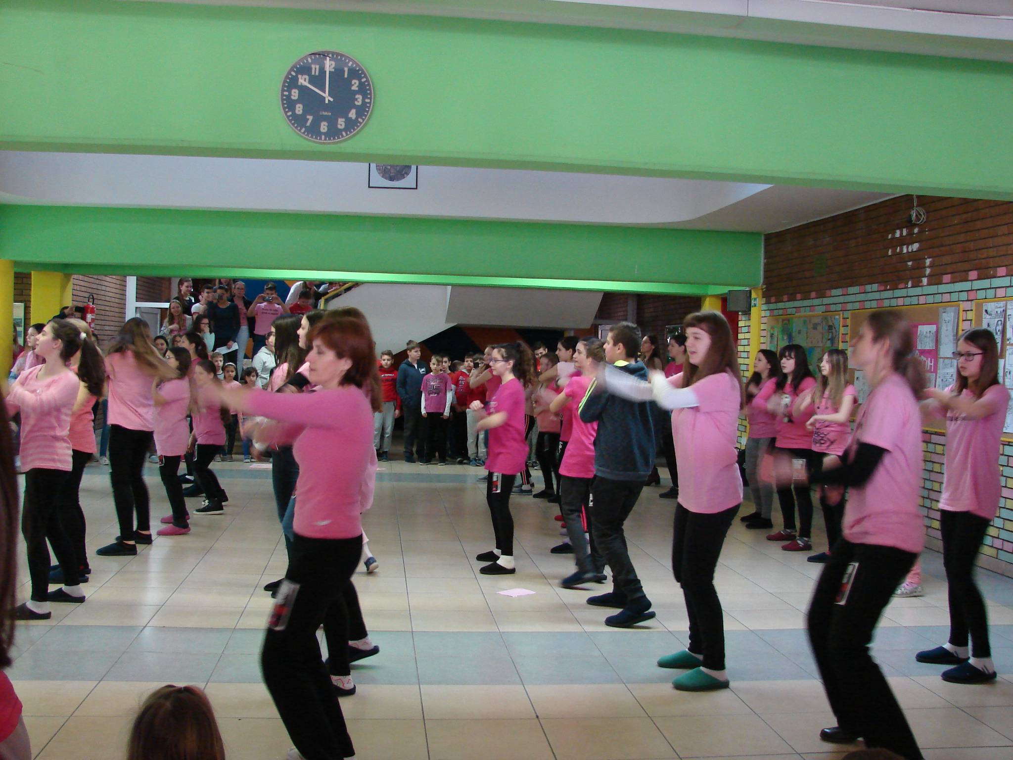 U srijedu na Dan ružičastih majica većina učenika, učitelja i ostali djelatnici nosili su nešto ružičasto. U holu škole za vrijeme velikog odmora, uz glazbu, učenici i učiteljice savršeno su otplesali uvježbani ples. Taj događaj izazvao je veliko zanimanje i doživljaj u školi jer smo pokazali da prihvaćamo ideju nulte tolarancije na nasilje.