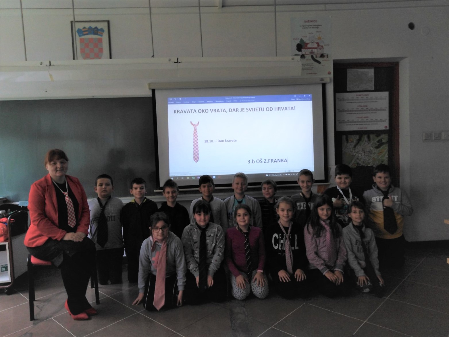 Kravata je poznati hrvatski dekorativni predmet i hrvatski simbol, ali i simbol Europe i znak nekih temeljnih ljudskih vrijednosti. Stoga je Academia Cravatica proglasila 18. listopada hrvatskim i svjetskim Danom kravate. U sklopu toga, 3. b i 1. b naše škole sa svojim učiteljicama obilježili su Dan kravate noseći oko vrata kravatu i ukrašavanjem panoa u razredu. Kravata je univerzalni simbol otmjenosti i kulture odijevanja, ali njezin moćni simbolički potencijal sadrži i mnoge druge vrijednosti. Obilježavanje Dana kravate pridonosi učvršćivanju i posvješćivanju svih pozitivnih identitetskih vrijednosti u hrvatskom društvu te prepoznatljivosti i pozitivnoj slici Hrvatske u svijetu.