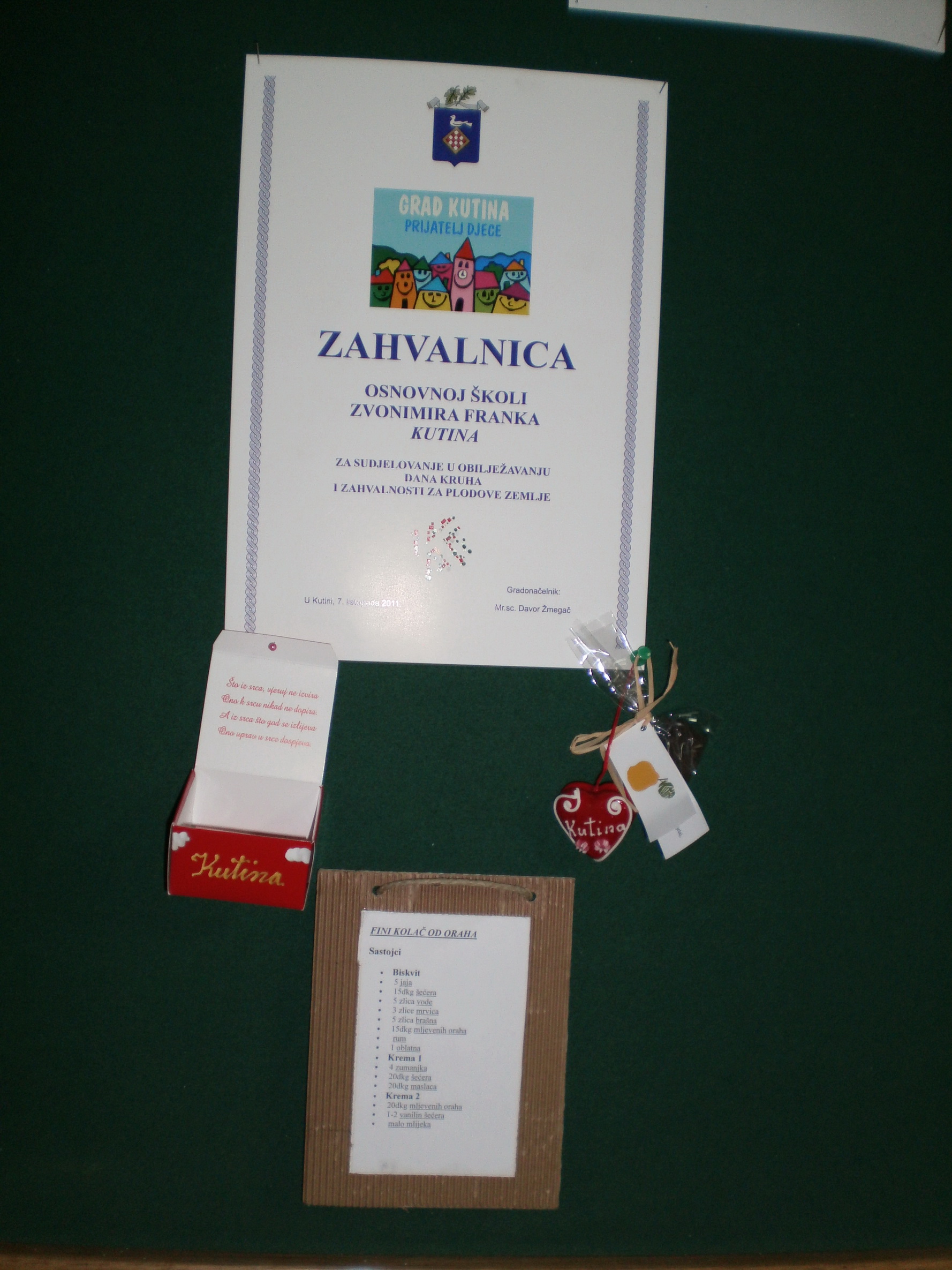 7. listopada 2011. održana je svečanost Dani kruha i zahvalnosti za plodove zemlje ispred Robnog centra u Kutini. Teme štanda naše škole bili su kruh i orah.