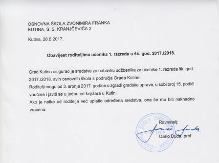 OBAVIJEST RODITELJIMA UČENIKA 1. RAZREDA