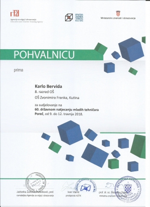 rezultat: Karlo Bervida (8.a) 6. mjesto u području elektrotehnike,