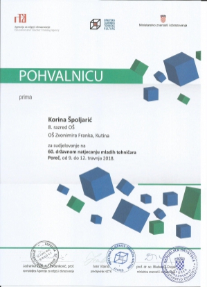 Korina Špoljarić (8.a) 11. mjesto u području elektronike.