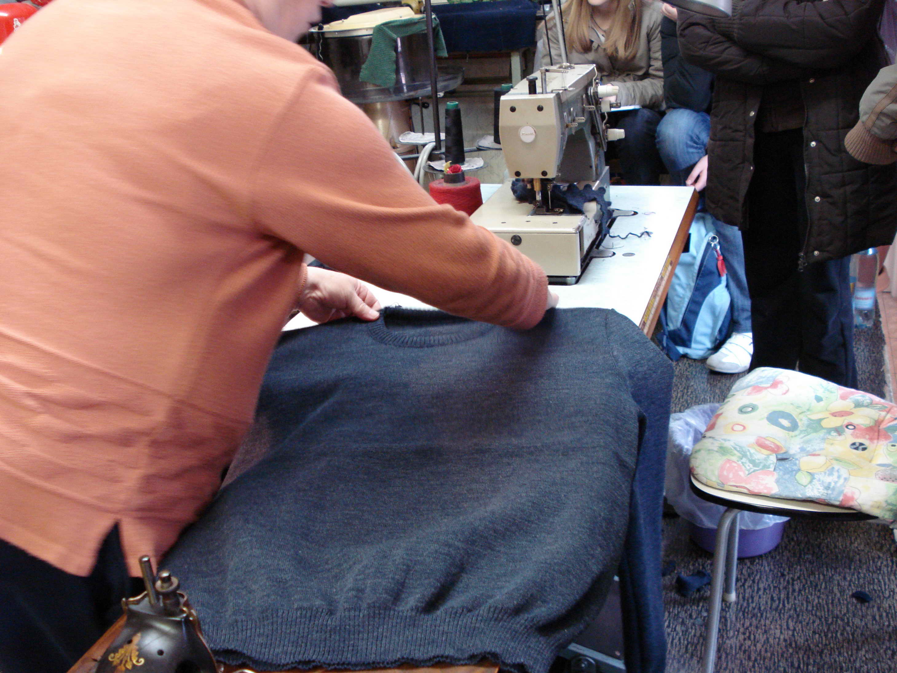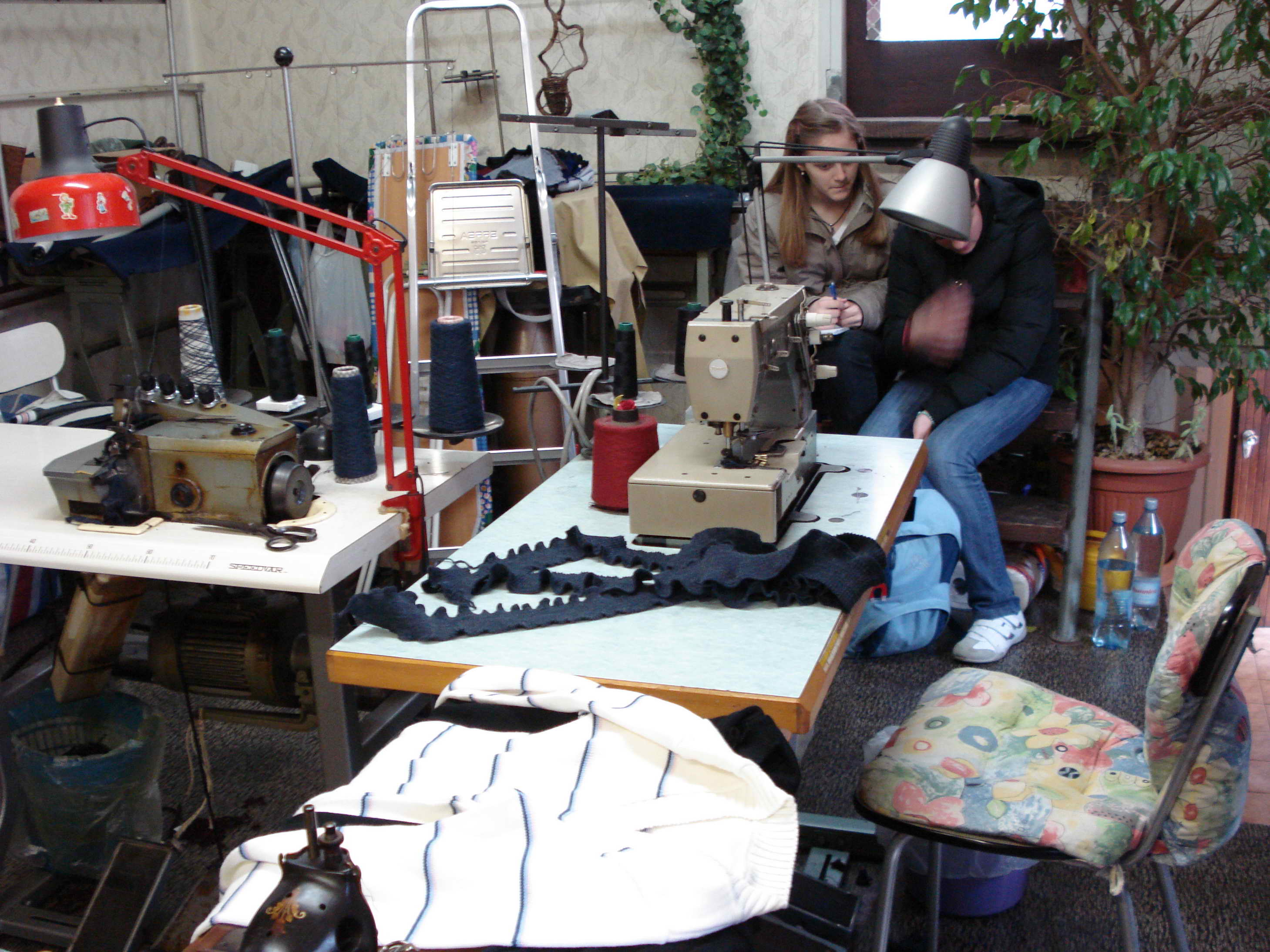 Pleteni dijelovi kroje se, obrađuju i šivaju u posebnoj prostoriji. Gospođa Kiš pokazala nam je veoma spretno kako se kroji, šiva i konačno nastaje muška vesta. Dugogodišnji rad i iskustvo omogućava joj da kroji veoma brzo i lako bez posebnih mjera.