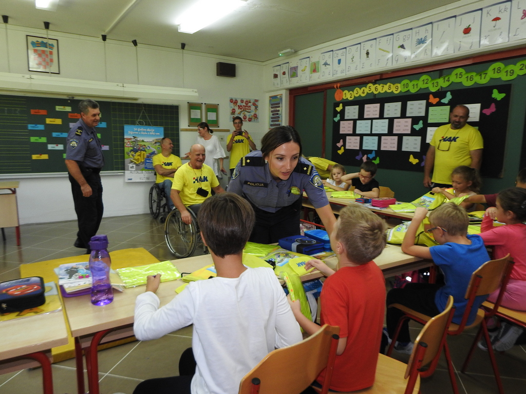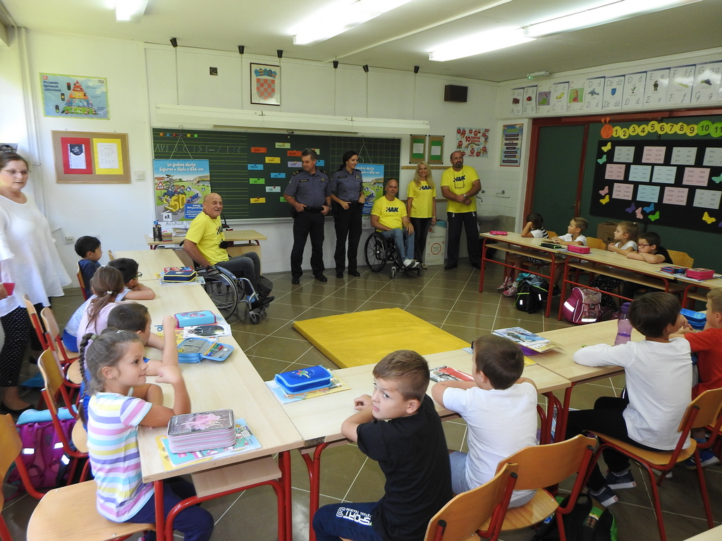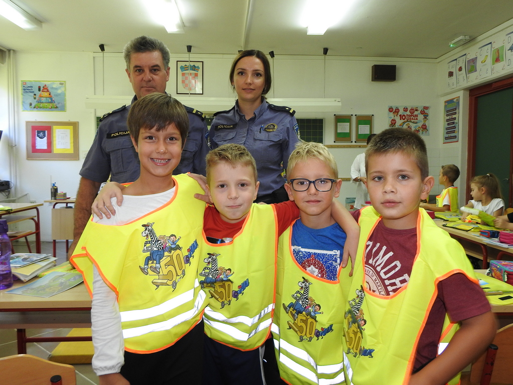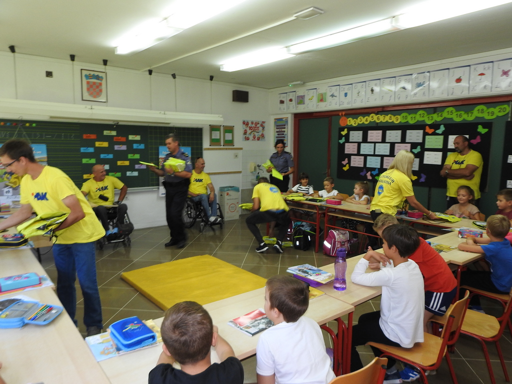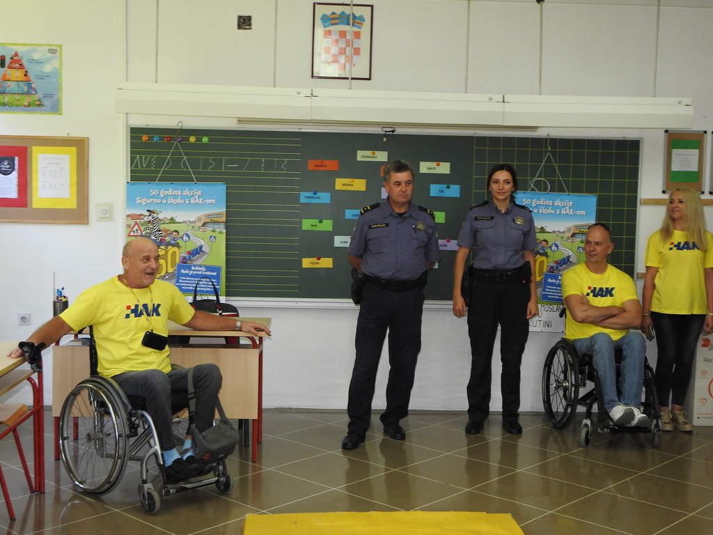 Hrvatski autoklub organizira prometno-edukativnu akciju "Sigurno u školu s HAK-om" na početku svake školske godine. Tako su i,ove godine, članovi AK Moslavina i djelatnici PP Kutina posjetili prvi razred naše škole. Održali su kratko predavanje za učenike koji prvi puta samostalno sudjeluju u prometu i upoznali ih s osnovnim prometnim pravilima. Na kraju druženja učenicima su uručeni prigodni darovi s edukativnim materijalima, kabanice i prsluci. Djeca su bila oduševljena, aktivno su sudjelovala u razgovoru s prometnim policajcem te radosno isprobala svijetleće kabanice i prsluke.