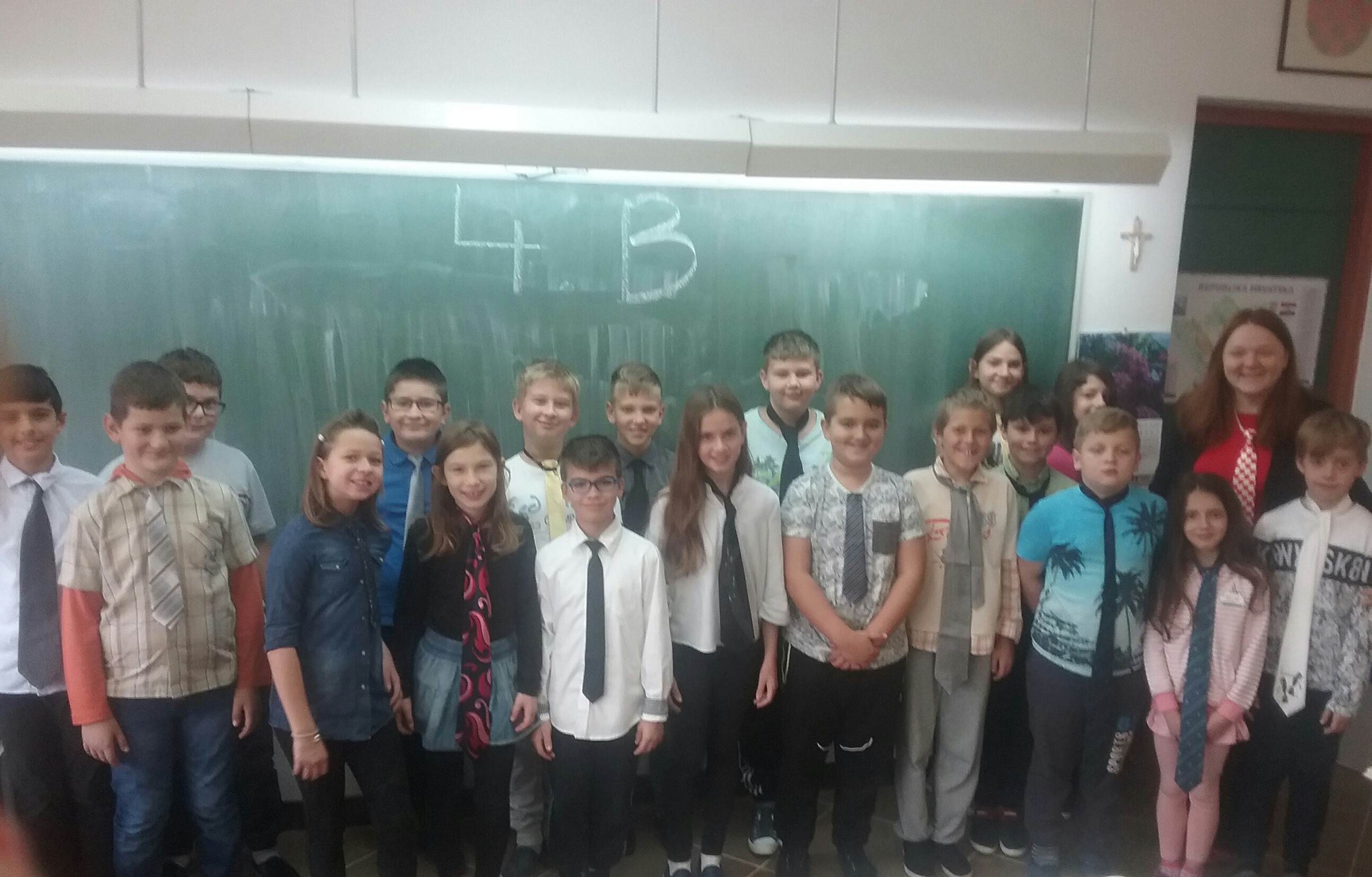 Učenici 4.b sa svojom učiteljicom obilježili su Svjetski dan kravate. Učenici su s veseljem iz ormara izvukli kravate svojih tata, djedova, braće, stričeva ili ujaka i veselo ih nosili cijeli dan. Kravata je jedinstveni i danas, globalno gledano, neizostavni modni dodatak. Obilježavanjem Dana kravate želi se naglasiti i osvijestiti da je ona autentični i izvorni hrvatski doprinos globalnoj kulturi odijevanja, ali i općoj kulturi. Kroz povijest, kravata je izrasla u simbol civiliziranog svijeta i u današnje vrijeme ona je simbol dostojanstva, svečanosti i otmjenosti. Naime, Hrvatski sabor 2008. godine iskazao je kravati posebnu počast proglasivši Dan kravate koji se obilježava svake godine 18. listopada.