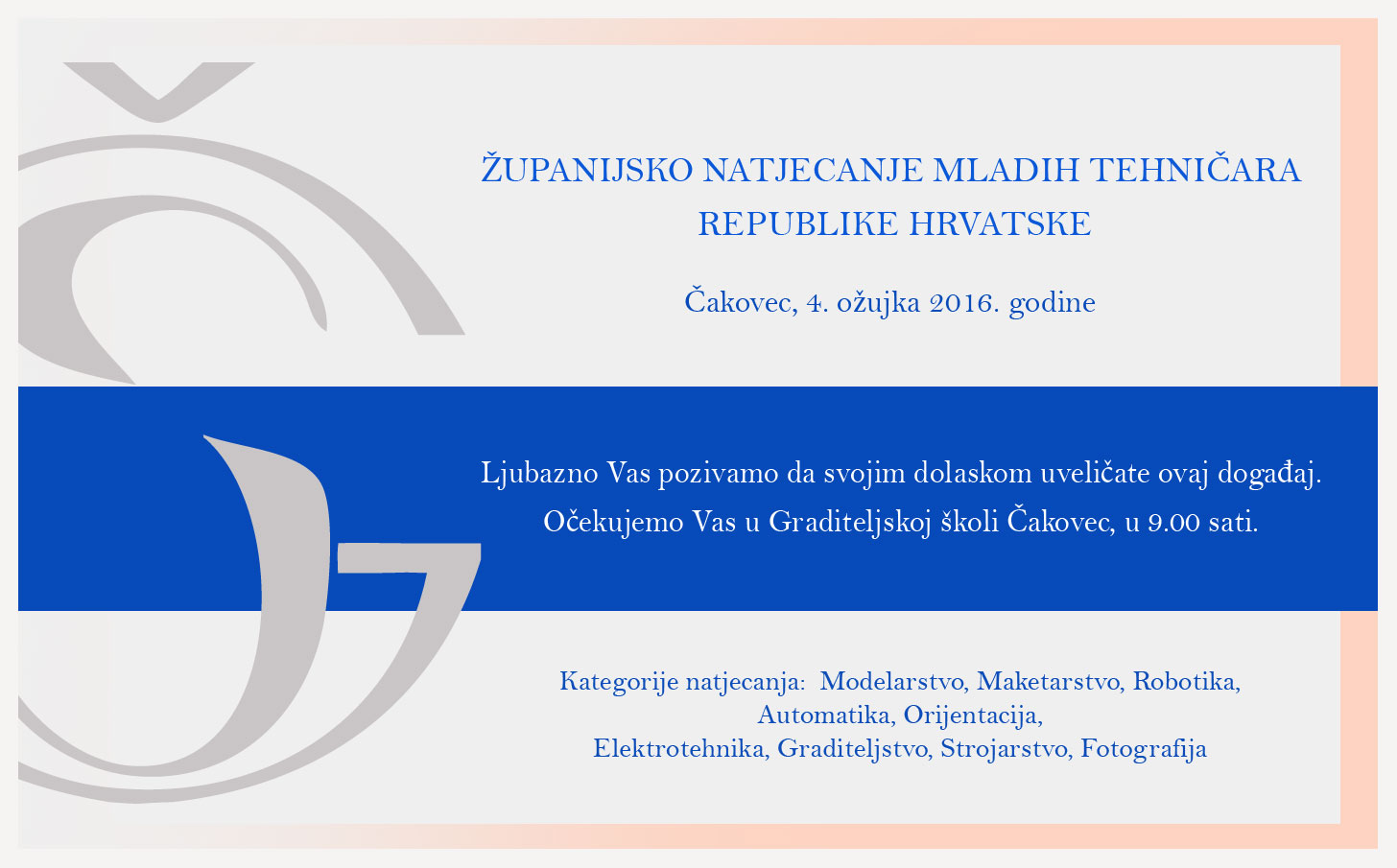 Graditeljska škola Čakovec bit će 4. ožujka domaćin Natjecanja mladih tehničara na županijskoj razini. Učenici osnovnih škola od 5. do 8. razreda natjecat će se u sljedećim kategorijama: maketarstvo i modelarstvo, graditeljstvo, elektronika, elektrotehnika, fotografija, modelarstvo uporabnih tehničkih tvorevina, orijentacija i komunikacija, strojarske konstrukcije, obrada materijala, robotika, robotsko spašavanje žrtve, automatika.