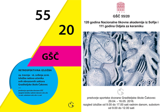 Od 29.travnja do 16.svibnja u holu dvorane postavljene su dvije izložbe - retrospektivna izložba radova učenika svih odjela, povodom 55_te obljetnice Graditeljske škole Čakovec i 20_te obljetnice odjela Likovne umjetnosti i dizajna, te izložba radova umjetnika iz Bugarske povodom 120 godina Nacionalne likovne akademije iz Sofije i 111 godina Odjela za keramiku. Obje izložbe možete pogledati radnim danom od 9.00 do 17.00 sati, te u subotu od 9.00 do 12.00 sati.