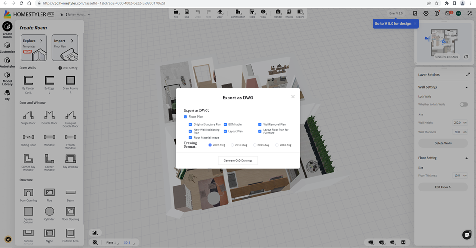 Program Homestyler 4.0 ima opciju exporta – izvoza datoteke napravljene u programu kao dwg i spremanja u verzijama 2007, 2010, 2013 i 2018. U okviru predmeta napravljena je vježba izvoza dwg u verziji 2018, a izvoz datoteke uključuje mogućnosti osnovnog spremanja tlocrta zidova, tlocrta s opremom, kotiranog tlocrta u milimetrima, a uključuje i tehničke informacije namjene i površina prostorija, prikazanih u okviru A3 formata. Uključeni su i slojevi za pojedinačne dijelove tlocrta s prikazom debljina i boja, tekstualnim i kotnim stilovima te elementima opreme u blokovima.