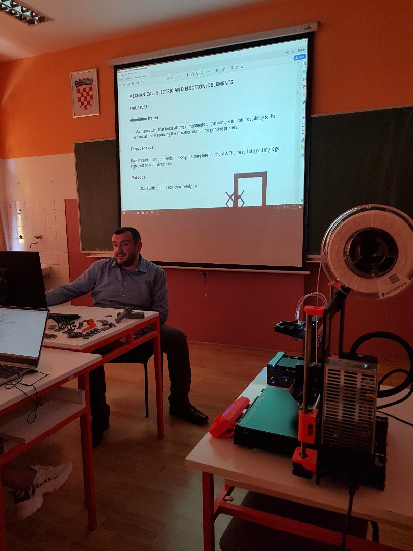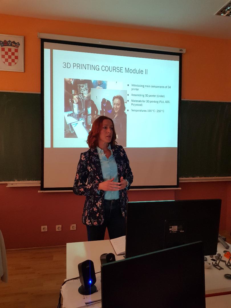 Tako je profesorica Čarapović ukazala na software kojim se koristi stvaranja modela koji će kasnije primiti svoj 3D oblik. Profesorica Vladić je u svojoj radionici naglasak stavila na hardverski dio postupka 3D printanja, dok je profesor Samardžija pokazao kako sastaviti 3D printer, ukazao na neke poteškoće koje se mogu javiti za vrijeme printanja i kako ih riješiti. Sudionici su mogli vidjeti isprintane 3D modele kao što su zviždaljka, fidget spinner, otvarač za boce, logo škole i drugi.