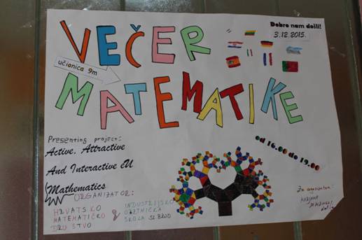 Iste večeri je učenicima predstavljen projekt „Active, Attractive And Interactive eU Mathematics“, u kojem naša škola sudjeluje kao partner zajedno s još 8 europskih zemalja: Španjolska, Portugal, Italija, Francuska, Njemačka, Litva, Estonija te koordinator-Bugarska.