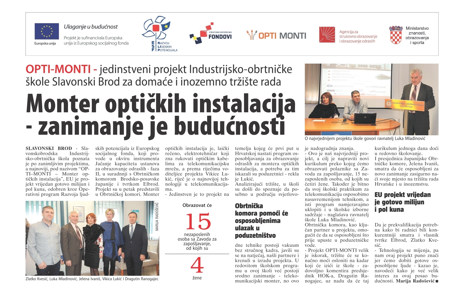 Nositelj projekta OPTI- MONZI je Industrijsko- obrtnička škola iz Slavonskog Broda a partneri na provedbi su Obrtnička komora Brodsko- posavske županije i tvrtka Elbrod d.o.o. koja je iskazala interes i potrebu za novim kadrovima kao što je Monter optičkih instalacija.- Novo tržište koje se otvara svakako je posao s optikom. Nova tehnologija traži educirani kadar u kojeg smo do sada morali sami ulagati. Uz pomoć ovog projekta i sami ćemo dobiti radnike spremne za tržište rada.- rekao je vlasnik tvrtke Elbrod Zlatko Kvesić.
