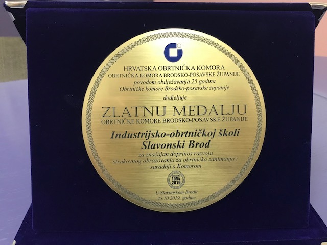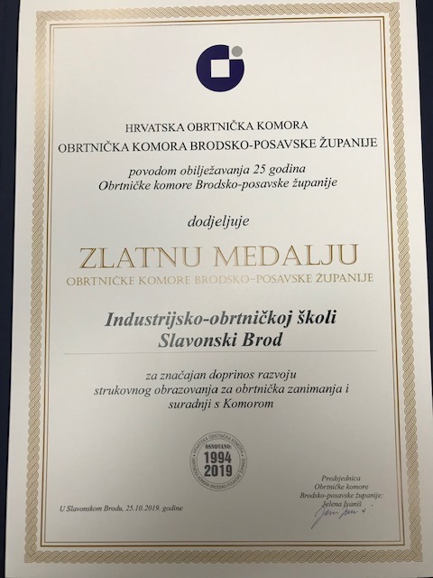 PRIZNANJE našoj Industrijsko-obrtničkoj školi za " značajan doprinos razvoju strukovnog obrazovanja za obrtnička zanimanja i suradnji s Hrvatskom obrtničkom komorom Brodsko- posavske županije". Hvala Komori i svim obrtnicima suradnicima na zajedničkoj organizaciji praktične nastave naših učenika te im čestitamo 25. obljetnicu djelovanja .