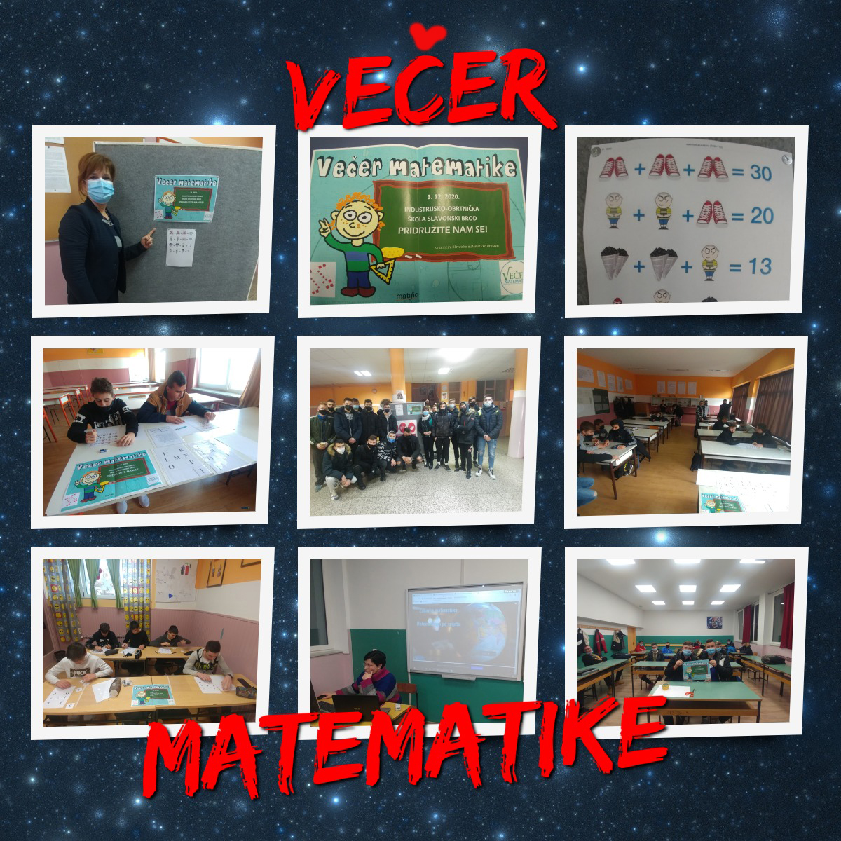 Večer matematike skup je interaktivnih radionica, raznih zadataka, zagonetaka i matematičkih pitalica u kojima sudjeluju učenici. Ovakva druženja potiču izgradnju pozitivnog stava učenika prema matematici. Sudjelovanje u zabavnim aktivnostima otkriva često zaboravljenu – zabavnu stranu matematike.