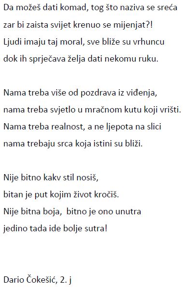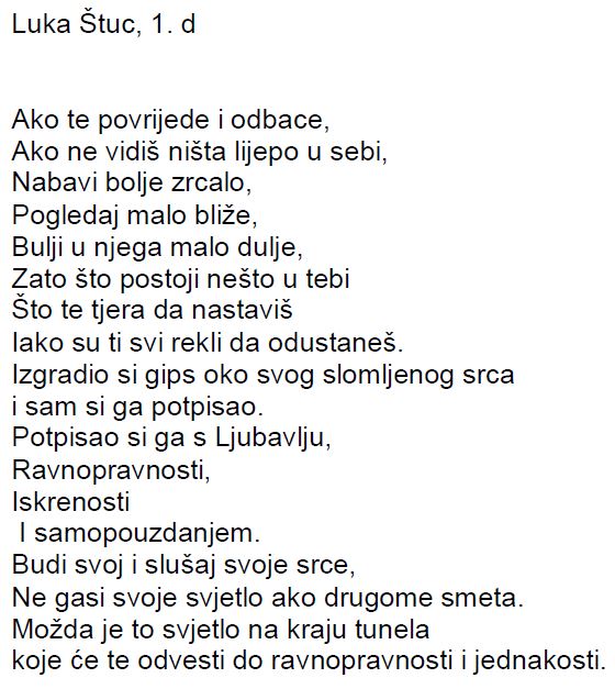 Učenici čije radove ćete čitati su: Karlo Soldan, 1.d, Luka Štuc, 1.d, Matija Kljufas, 3.d, Mario Jelušić, 3.h, Nikola Juraja, 3.h, Dario Čokešić, 2.j, Dorijan Šimunović, 2.j, Dario Jagar, 2.g i još nekoliko anonimnih autora.