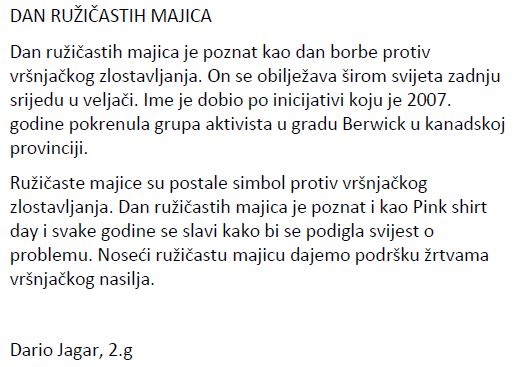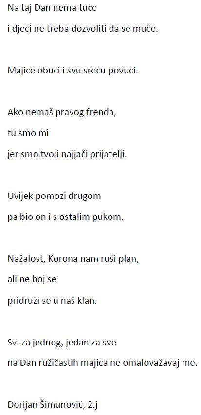 Danas se obilježava Nacionalni dan borbe protiv vršnjačkog nasilja poznatiji kao Dan ružičastih majica. Zamolili smo naše učenike da nam prenesu svoja razmišljanja o toj važnoj temi i na današnji dan predstavljamo njihove stihove, hrabre poruke, duboke misli i važne poruke mladima.