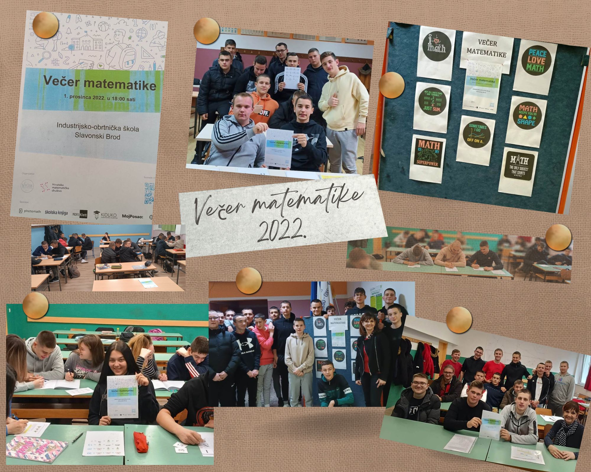 Večer matematike skup je interaktivnih radionica, raznih zadataka, zagonetaka i matematičkih pitalica u kojima sudjeluju učenici. Ovakva druženja potiču izgradnju pozitivnog stava učenika prema matematici. Sudjelovanje u različitim aktivnostima otkriva često zaboravljenu –zabavnu stranu matematike.