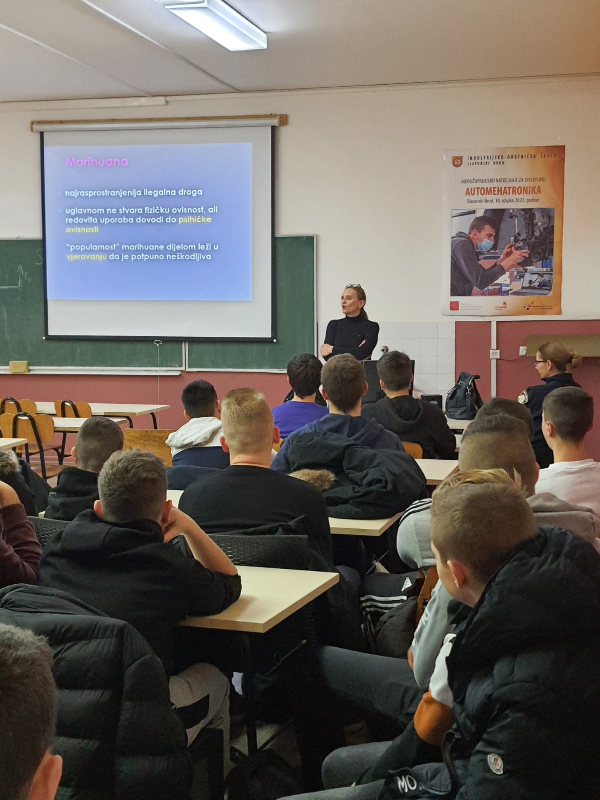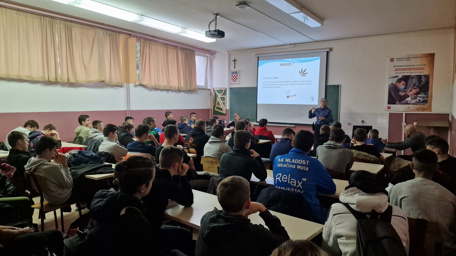 Povodom Mjeseca borbe protiv ovisnosti koji se svake godine obilježava od 15.studenog do 15. prosinca održano je zanimljivo predavanje djelatnica Policijske uprave Brodsko-posavske županije i Službe za zaštitu mentalnog zdravlja, prevenciju i izvanbolničko liječenje ovisnosti Hrvatskog zavoda za javno zdravstvo. Kriminalistica Irena Held i soc.radnica Tamara Brezičević su 7.12. i 8.12. 2022. u sklopu projekta "Zdrav za 5" održale predavanja o kaznenoj odgovornosti mladih u kontekstu upotrebe sredstava ovisnosti i utjecaja sredstava ovisnosti i posljedica koje ostavljaju na adolescente.