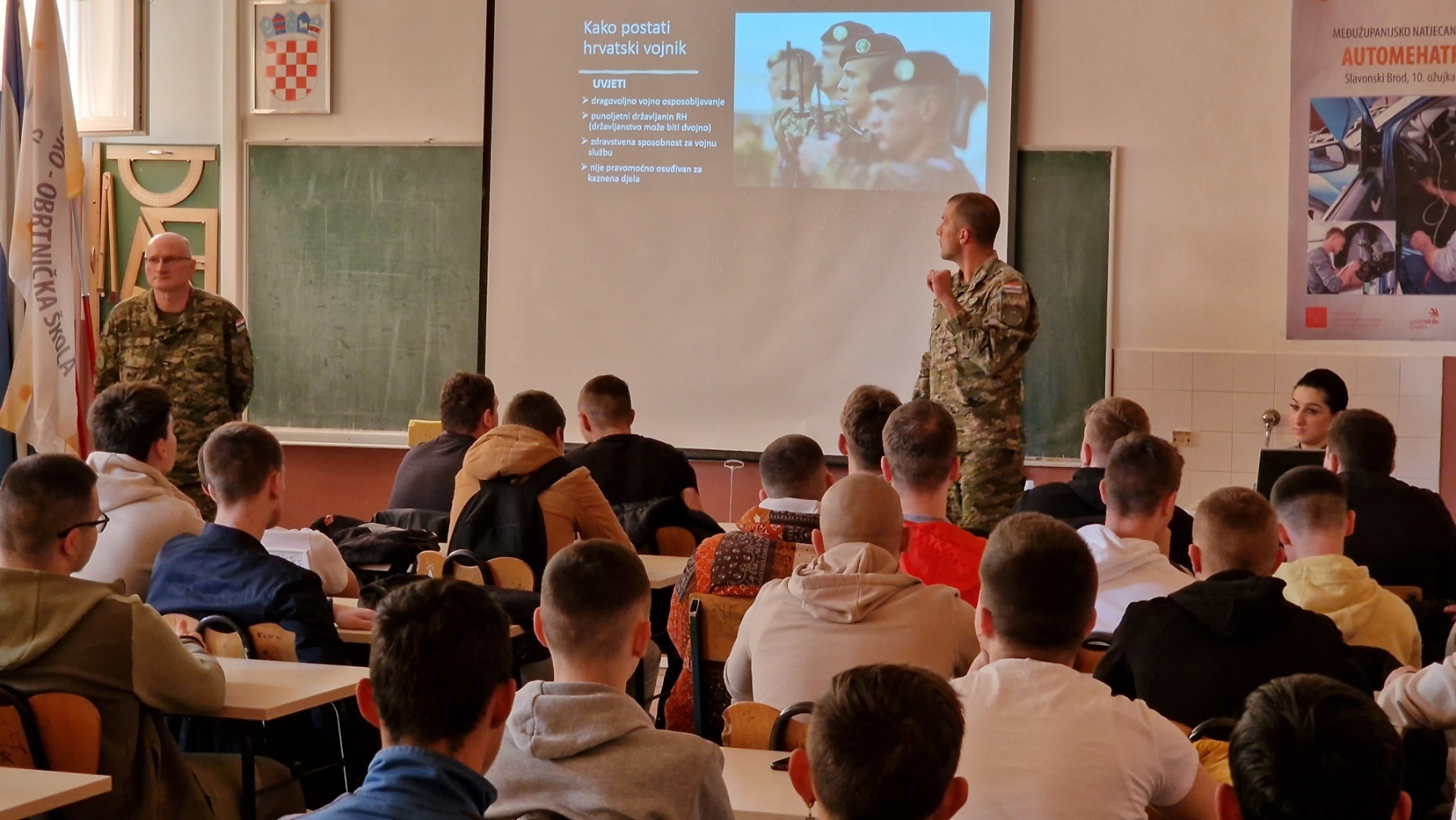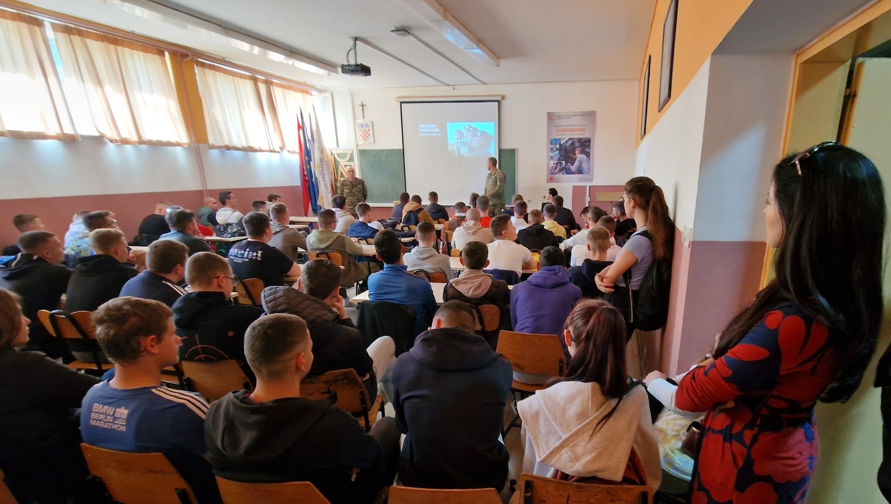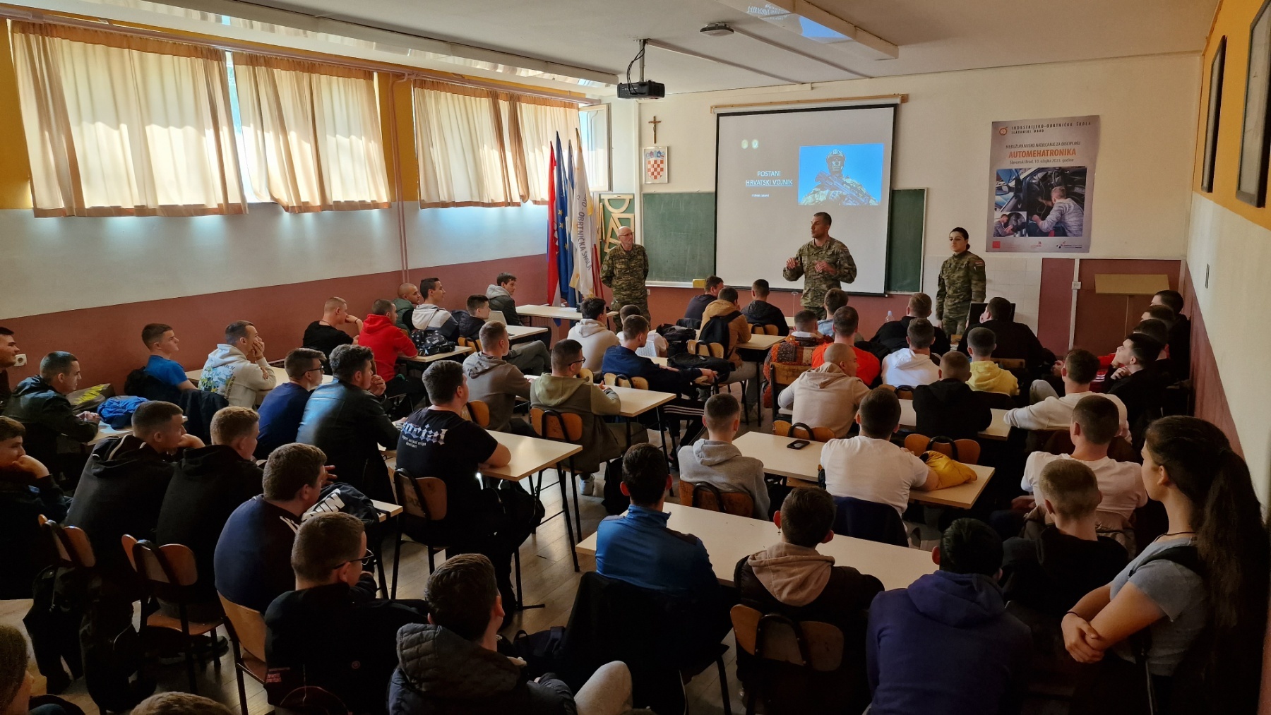 U našoj školi, dana 22. ožujka 2023., predstavnici MORH-a održali su predavanje učenicima završnih razreda i svim zainteresiranim učenicima, na temu dragovoljnog vojnog osposobljavanja. Učenici su zainteresirano slušali o uvjetima koje moraju ispunjavati da bi ostvarili dragovoljno vojno osposobljavanje te moguće daljnje zaposlenje. Zanimljivom prezentacijom, predstavnici MORH-a pružili su učenicima sve potrebne podatke i dočarali uvjete obuke i zanimanja vojnika profesionalaca.