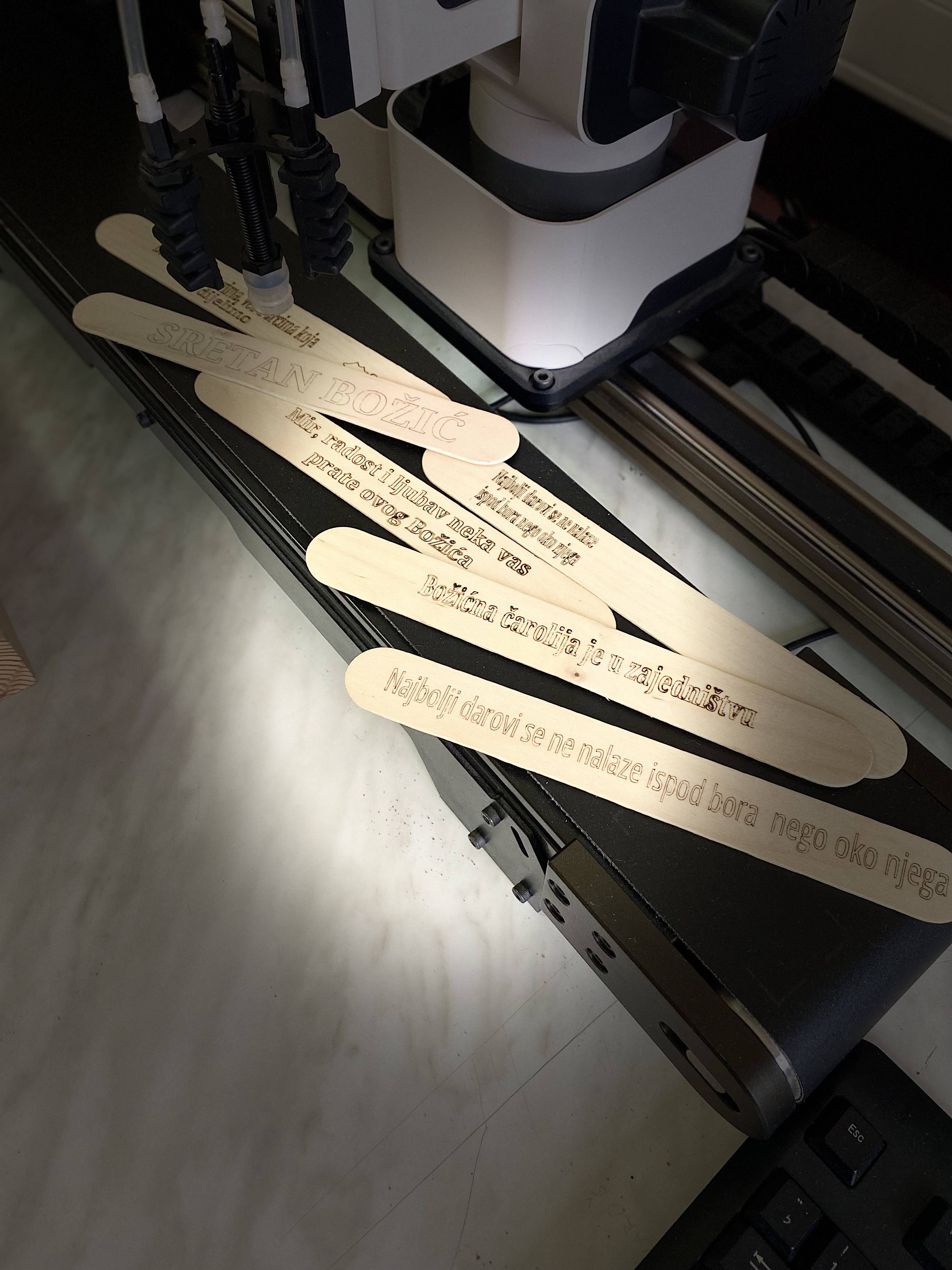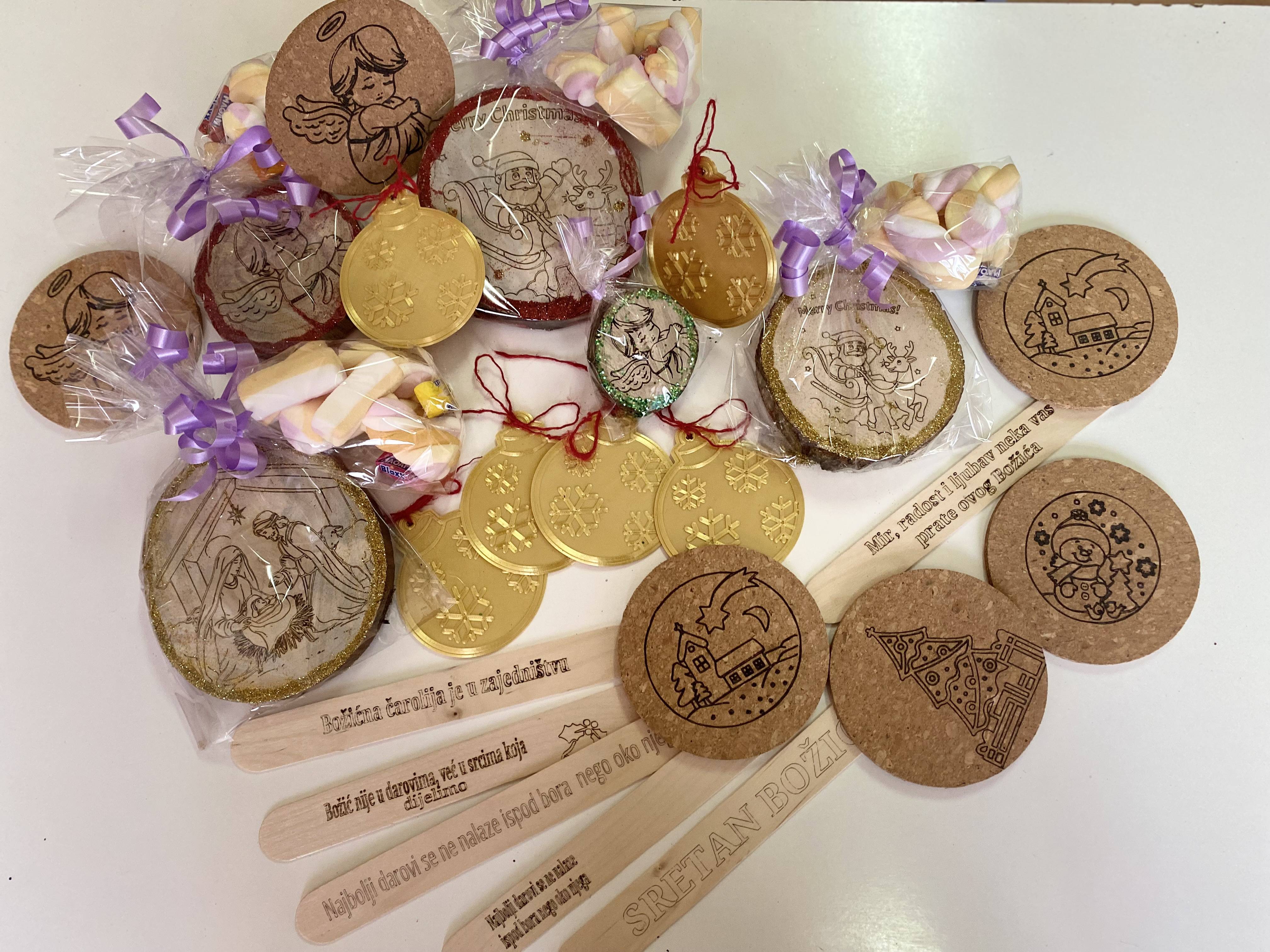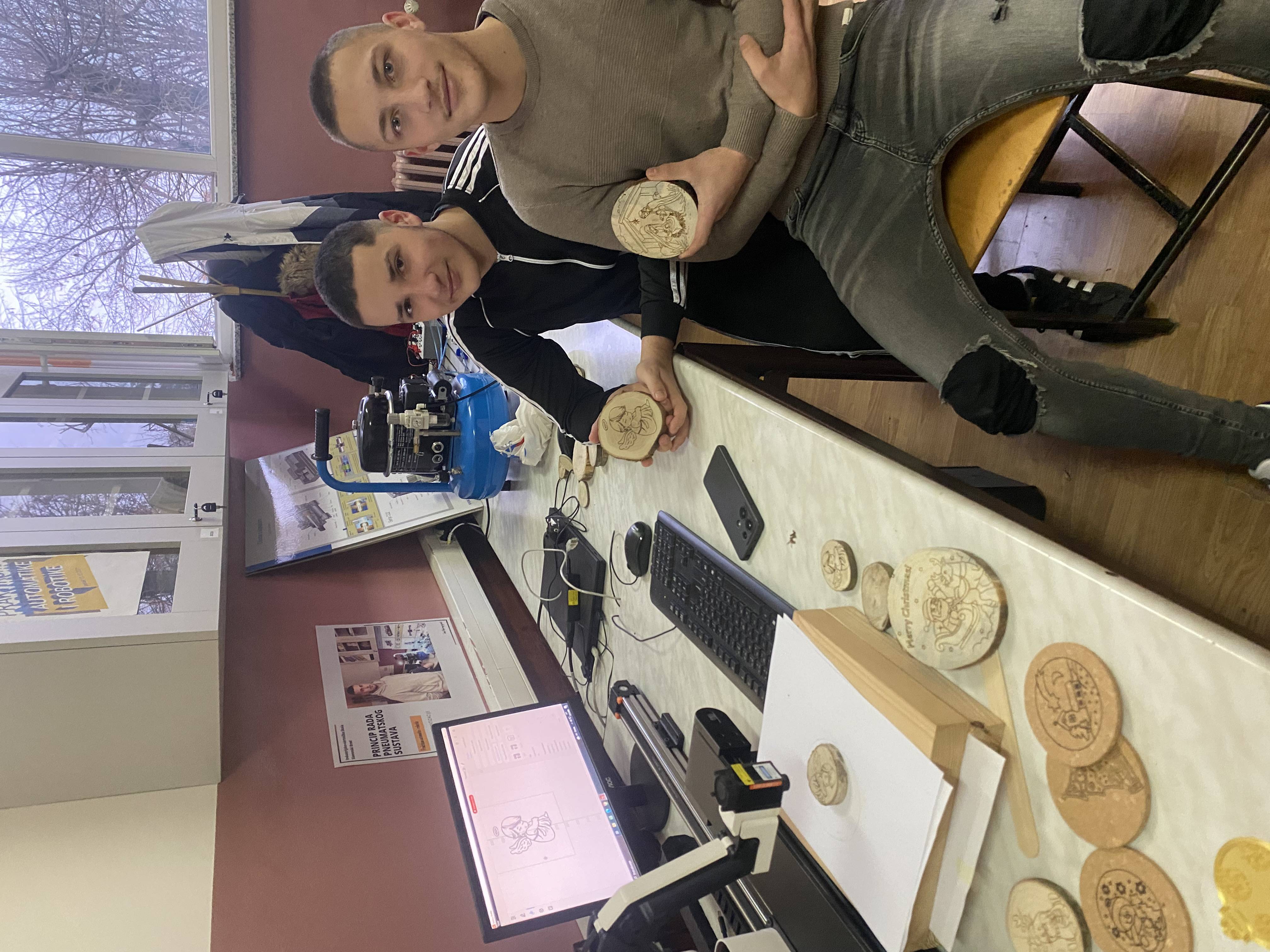 Tijekom prosinca unutrašnji prostor škole polako poprima božićni duh. Svi se trude prigodnim dekoracijama prostor škole učiniti toplijim. Blagdani su vrijeme radosti i darivanja, ali i vrijeme koje možemo iskoristiti kako bismo proveli više vremena sa svojim bližnjima. Nešto najbolje što možemo pokloniti djeci za Božić je zajedničko vrijeme i druženje. Ove godine učenici 3.a su imali zadatak, da sa svojom razrednicom Ivanom Vladić, osmisle i izrade božićne ukrase od prirodnih materijala. Učenici su donijeli materijal-drvo, kolege iz radionice zajedno s učenicima na praksi su materijal obrusili. U praktikumu automatike i robotike pripremili smo prigodne božićne motive putem programa Inkscape i generirali G kod u Rotriks-u, koji smo gravirali laserom pomoću robotske ruke na odabranom materijalu. Učenici 3.a razreda sa svojom razrednicom osmislili su i izradili božićno drvce od prirodnih materijala iz našeg vrta, koje krasi ulaz naše škole. Pomoću 3d printera otprintali smo kuglice za bor. Hvala svim učenicima na sudjelovanju.