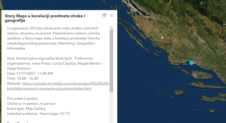 Dugi niz godina raspravlja se o implementaciji digitalne kartografije u srednjim školama. Cilj je uvesti suvremenu informacijsko-komunikacijsku tehnologiju (IKT) u procese učenja i poučavanja u srednjim školama. U našoj školi koristimo GIS alat zadnje dvije godine s ciljem povezivanja strukovnih i općeobrazovnih predmeta. Obilježavamo GIS day svaku treću srijedu u studenom i tom prilikom izlažemo radove naših učenika pod mentorstvom profesorice Ivane Prezzi i profesorice Magde Barišić u suradnji s profesoricom informatike Vanjom Perković i profesoricom geografije Lucijom Čapalija GIS Day širom svijeta Upotrijebite KARTU kako bi pronašli događaj GIS Day u vašoj blizini . Kliknite na lokaciju i saznajte više o događaju.