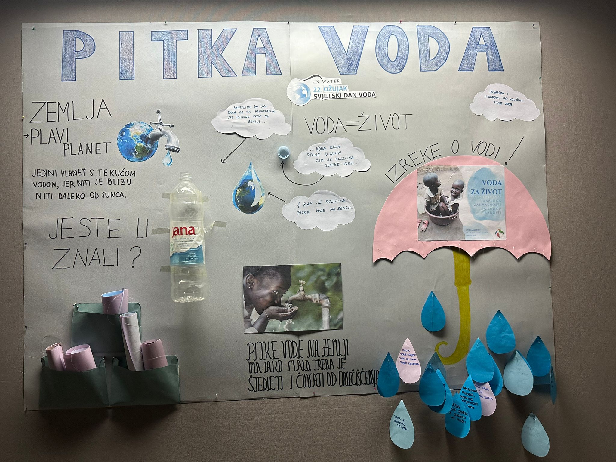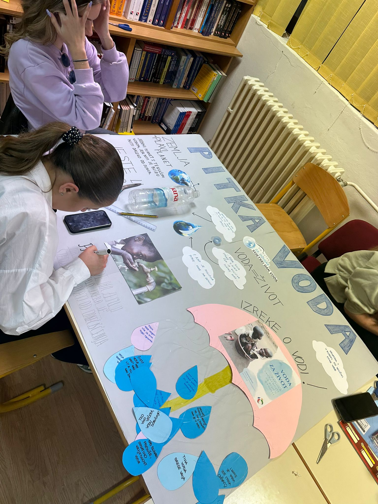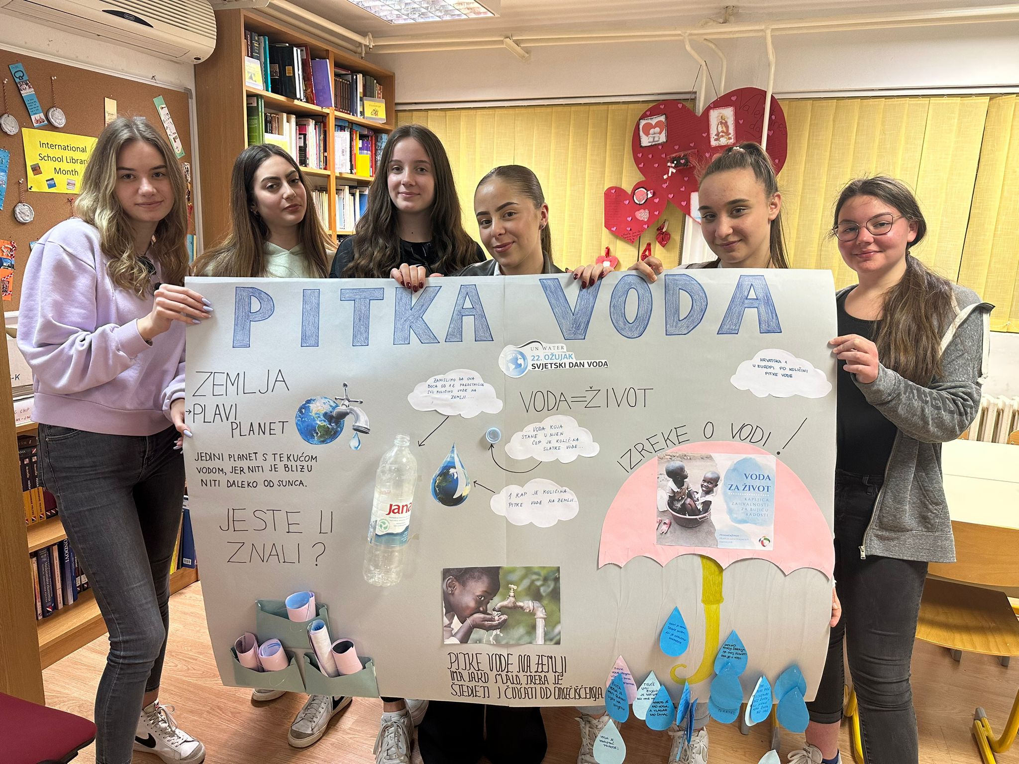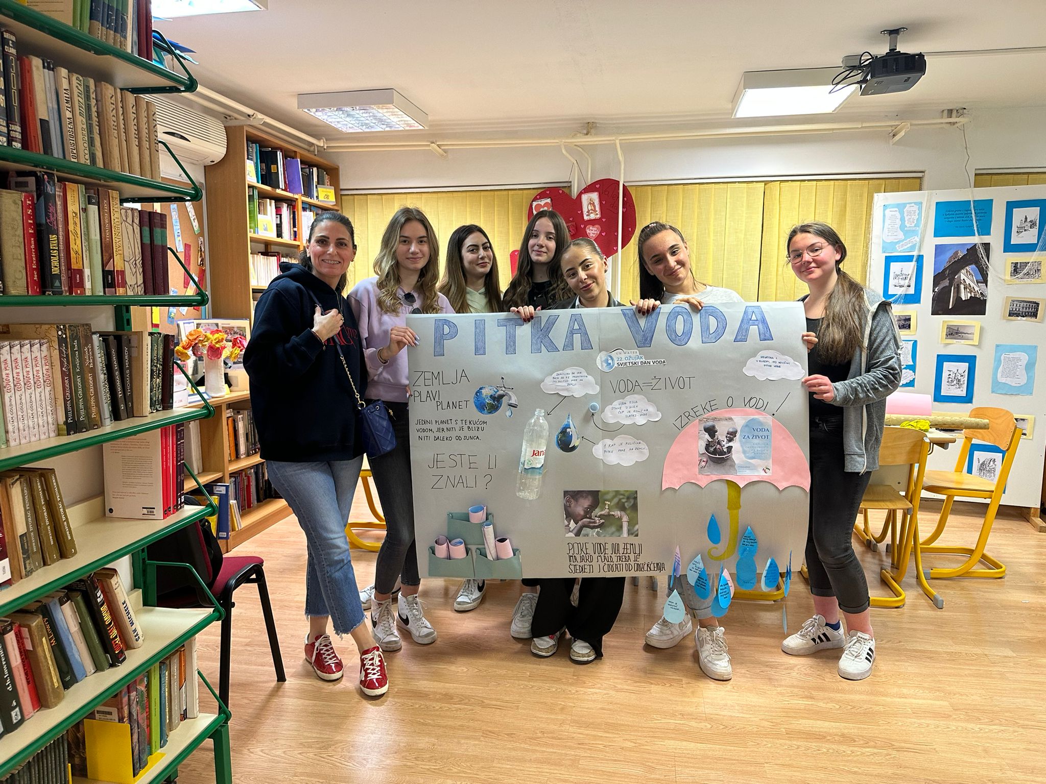 Naša je škola obilježila svjetski dan voda u korelaciji predmeta Geografija i Poznavanje robe. Jučer, 22.03.2023. učenici su nakon nastave imali dodatne aktivnosti. Profesorica Antonija Slavica ih je u sklopu nastavnog predmeta Poznavanje robe upoznala sa važnim činjenicama uz pitku vodu, a jedna od njih je i ta da Hrvatska zauzima 1.mjesto u Europi po opskrbi stanovništva pitkom vodom. Čak 98% stanovnika Hrvatske ima pristup pitkoj vodi iz vodoopskrbnog lanca. Profesorica Lucija Čapalija iz Geografije potom je s učenicima posjetila školsku knjižnicu. Zadatak je bio napraviti plakat kojim će se potaknuti svijest učenika o važnosti pitke vode. Učenici su se upoznali sa zemljama svijeta čije stanovništvo ima trajni nedostatak pitke vode. Svake godine zbog nedostatka pitke vode umre 3 milijuna djece mlađe od 3 godine.