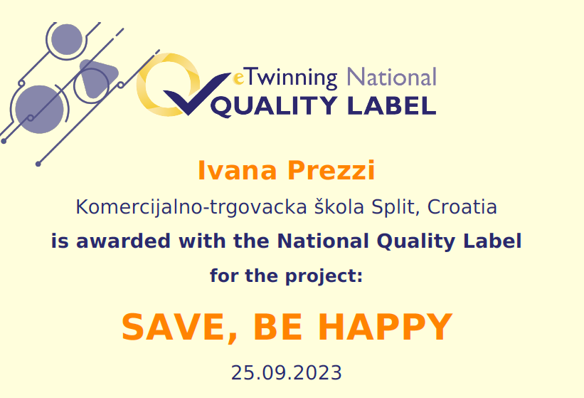 NACIONALNA OZNAKA KVALITETE ZA eTWINNING PROJEKT SAVE, BE HAPPY