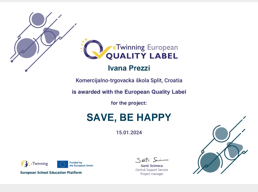 Međunarodni eTwinning projekt „SAVE, BE HAPPY“, čiji je sudionik i naša škola, je nagrađen Europskom oznakom kvalitete. Rad učenika i suradnja među partnerima ovog projekta su zadovoljili kriterije Okvira oznake kvalitete i dobili visoku ocjenu. Iz tog razloga projekt „SAVE, BE HAPPY“ će biti predstavljen u posebnom dijelu na Europskoj školskoj obrazovnoj platformi ESEP (https://school-education.ec.europa.eu/).