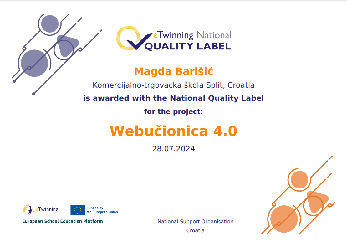eTwinning projekt Webučionica 4.0 nagrađen Nacionalnom oznakom kvalitete