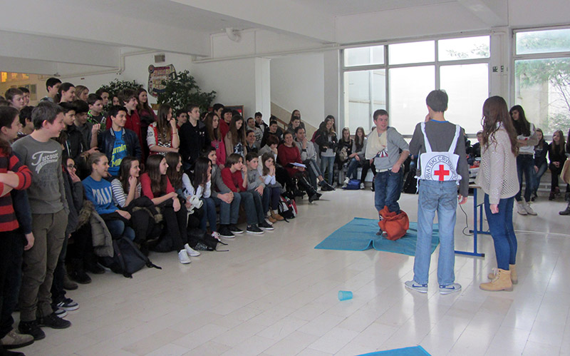Učenici 7. i 8. razreda OŠ Lapad imali su priliku naučiti osnove pružanja prve pomoći unesrećenima zahvaljujući mladim volonterima Crvenog križa Dubrovnika, mahom učenicima 4.b razreda naše Škole. Učenici su pozorno pratili zanimljiv sat na kojem je teoretski dio predstavila Antonija Merčep, učenica 3. razreda srednje škole, inače bivša učenica lapadske škole. Praktični dio bio je i dramatski osmišljen te je privukao veliku pozornost učenika. Volonteri Krešo, Ivana , Mihaela, Ivana i ostali izveli su nekoliko praktičnih vježbi i prikazali kako pružiti prvu pomoć pri nesvjestici, opeklinama 2. stupnja te kako sanirati strano tijelo i iščašeni zglob. Znanje koje su učenici pokazali u kvizovima nakon predavanja potvrđuje da je ovo predavanje bilo itekako korisno i da su ga učenici pažljivo pratili. Smatramo kako je ovakva predavanja potrebno ponavljati i više puta tijekom godine jer su znanje i vještine kako pomagati ljudima oko sebe u različitim nezgodama, u kojima je najbitnije ostati pribran i znati ispravno postupiti, vrijedne i korisne životne vještine. Osim u OŠ Lapad, predavanje i simulacija je održana i u OŠ Marina Getaldića. I u toj su školi naše volontere učenici shvatili vrlo ozbiljno svjesni kako se nezgode ne događaju samo drugima.