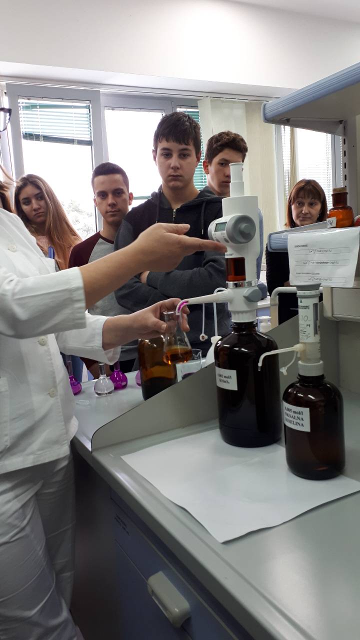 U petak, 23.02.2018. bili smo u posjetu Zavodu za javno zdravstvo, kako bi smo se kao budući farmaceuti informirali nešto više o radu u laboratoriju. Marija Jadrušić, dipl. ing. med. biokemije - Voditeljica Odjela za vode, u Zavodu nas je provela kroz laboratorij- gdje smo se upoznali s postupkom mjerenja krute tvari i pripravom njezine otopine u odmjernoj tikvici određenog volumena.Takodjer nas je upoznala s različitim laboratorijskim posuđem od kojih su nam neka bila poznata iz predmeta Uvoda za lab.rad, kao pipete različitih volumena, menzure, cilindri. Upoznali smo i neka nova i njihov način rada kao što su automatske birete i automatske pipete. Zatim nam je demonstrirala pripravu razrijeđenih otopina kalijeva permanganata u četiri odmjerne tikvice različitih volumena, te smo uočili različite ljubičaste boje otopina. Na kraju smo dobili i domaći rad, da zajedno s razrednicom izračunamo koncentracije pripremljenih otopina,čime smo bili svi oduševljeni. Učenici 1.a razreda