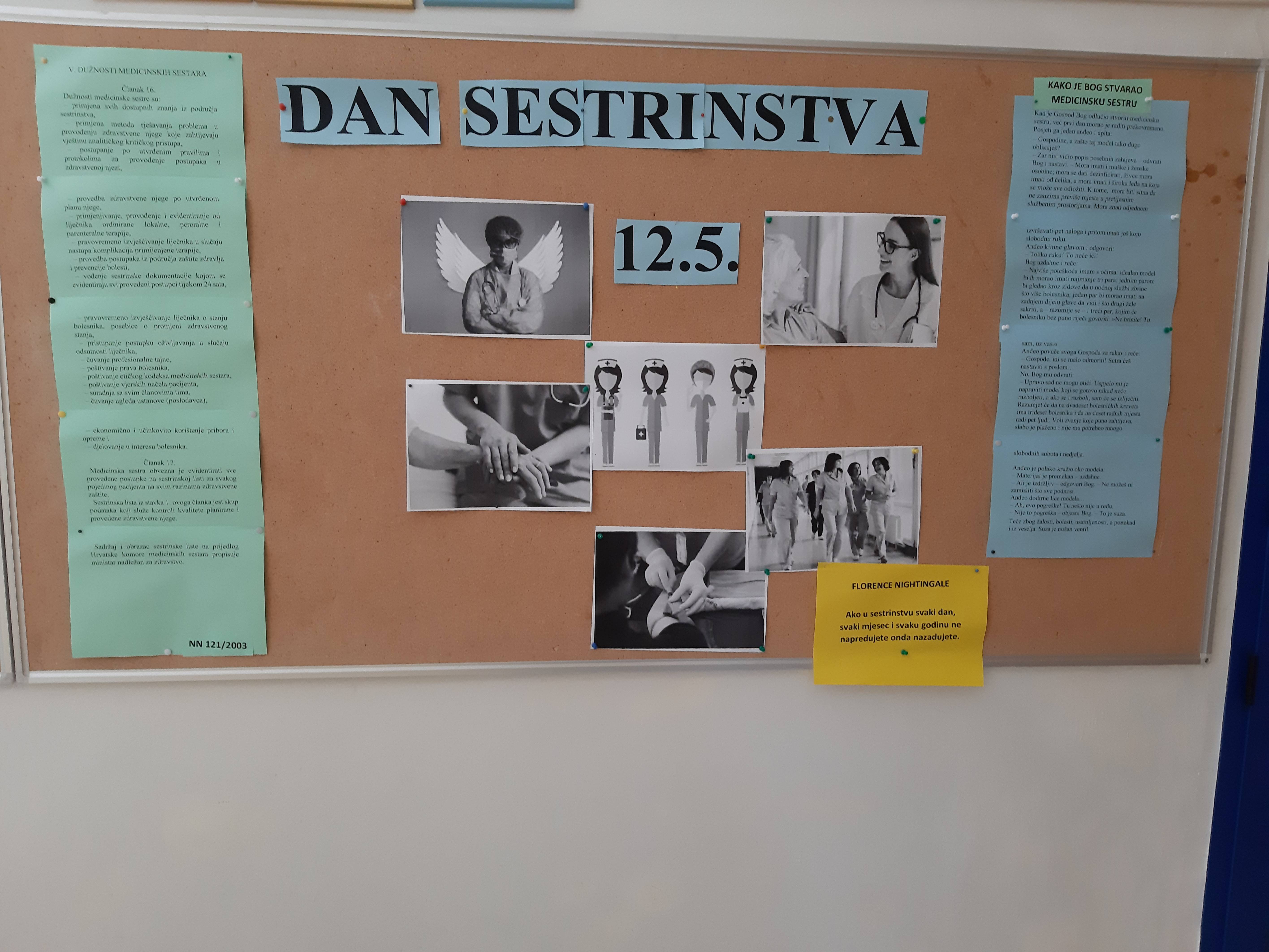 Kad ste medicinska sestra, znate da će te svaki dan dotaknuti život ili će život dotaknuti vas. F. Nightingale Školski pano na temu “Sestrinstvo 2021. izradile učenice 4. b razreda. Pano prikazuje sestrinstvo kao zvanje koje traži zakonske, ljudske i nadasve etičke postavke svake medicinske sestre pojedinačno uz predano cijeloživotno učenje. Predavanje i radionicu na temu “Suvremeni pristup njezi kronične rane” održala je prestavnica Stoma medicala Marina Odžak, mag.med.techn. u koordinaciji predmetnom nastavnicom Marijom Čupić, mag. med.techn. Učenici završnih razreda MSONJ/MTONJ slušali su o novostima u primjeni suvremenih obloga, primjere dobre prakse i najnovija znanstvena istraživanja koja potvrđuju rezultate liječenja kronične rane primjenom suvremenih obloga. Uz predavanje upriličeno je prigodno druženje u dvorištu Škole. Predavanju su nazočile sve strukovne nastavnice. Učenici završnih razreda uključili su se u akciju Kaftrio-udah života koja se provodi kako bi se potaklo proizvođača lijekova Vertex Pharmaceuticals da svoje lijekove stavi na listu HZZO-a kao moguću modularnu terapiju. Humanitarna akcija “Moja kava za Cernacolo” organizirana je za prikuplanje higijenskih paketa koji će biti distribuirani u Zajednicu Cernacolo. Aktivnosti tjedna sestrinstva organizirale su nastavnice članice Stručnog aktiva.