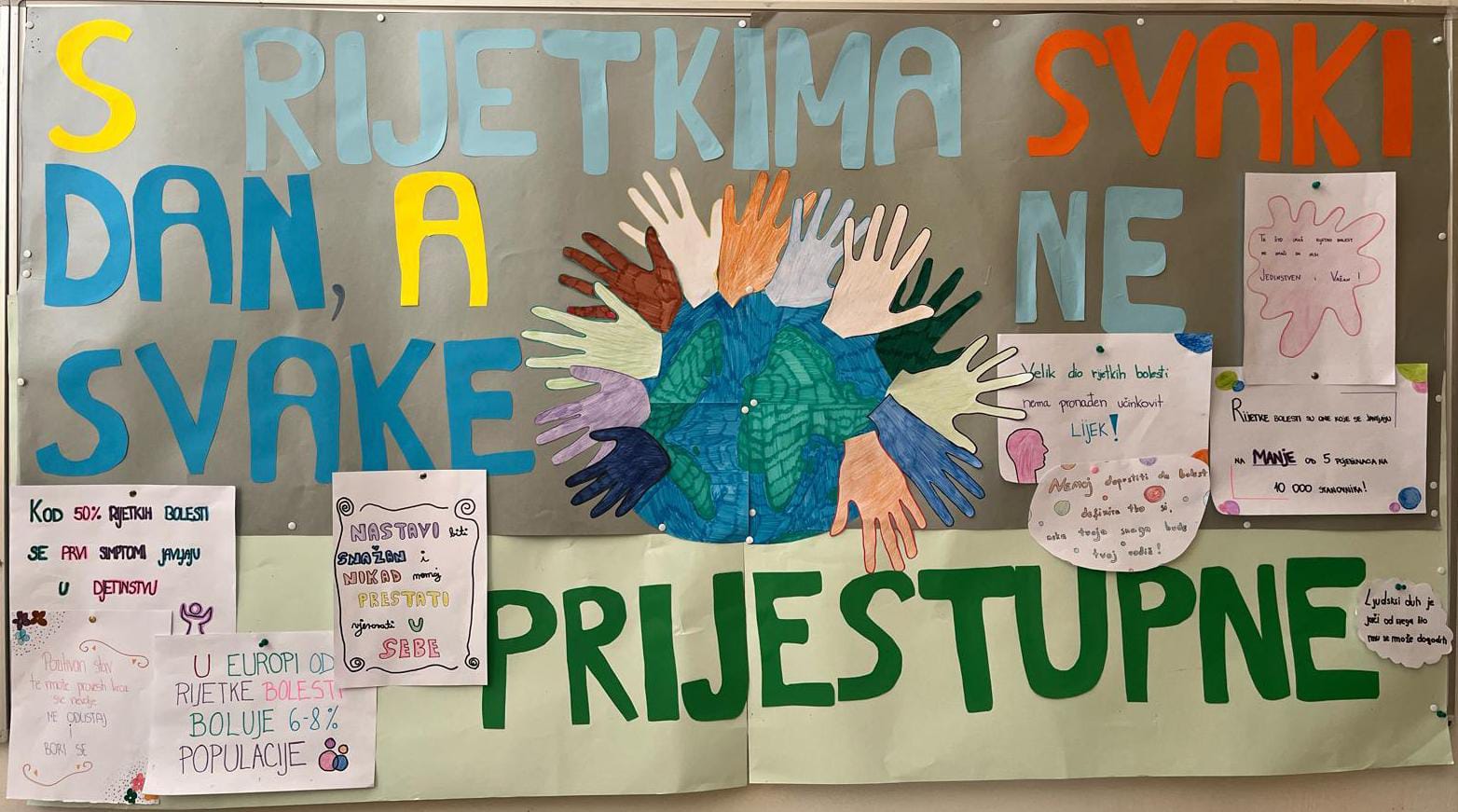 Medicinska škola Dubrovnik uključila se u program obilježavanja Međunarodnog dana rijetkih bolesti. Učenici su u sklopu nastavnog predmeta Etika u sestrinstvu istraživali o obilježjima rijetkih bolesti i životu oboljelih i njihovih obitelji. Došli smo do raznih saznanja o rijetkim bolestima. Uočili smo da je puno izazova s kojima se oboljeli i njihove obitelji susreću. Vrlo često se takve dijagnoze kasno otkrivaju i utječu na kvalitetu života. Za veliki dio rijetkih bolesti lijek ne postoji. Oboljeli se vrlo često susreću s nerazumijevanjem okoline. I baš zato su učenici izradili edukativni pano gdje su napisali kratke informativne kartice o rijetkim bolestima. No, napisali su i motivacijske poruke za sve oboljele. Željeli smo im poslati poruku da nisu sami i da mislimo na njih. Oboljele od rijetkih bolesti ne smijemo gledati kroz dijagnozu. Oboljele gledamo kao naše prijatelje koje ćemo uzeti za ruke i zajedno koračati prema boljem sutra. Želimo izgraditi svijet koji prihvaća različitosti. Želimo izgraditi svijet pun ljubavi za oboljele od rijetkih bolesti. Oni to zaslužuju.