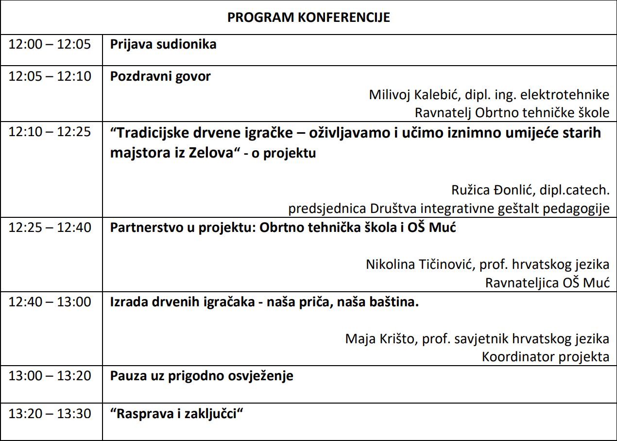 U sklopu projekta “Tradicijske drvene igračke – oživljavamo i učimo iznimno umijeće starih majstora iz Zelova“, koji se provodi pod vodstvom udruge "Društvo intergrativne geštalt pedagogije" (DIGP), u sklopu kojeg je i Obrtna tehnička škola partner na projektu,  održava se uvodna konferencija dana: