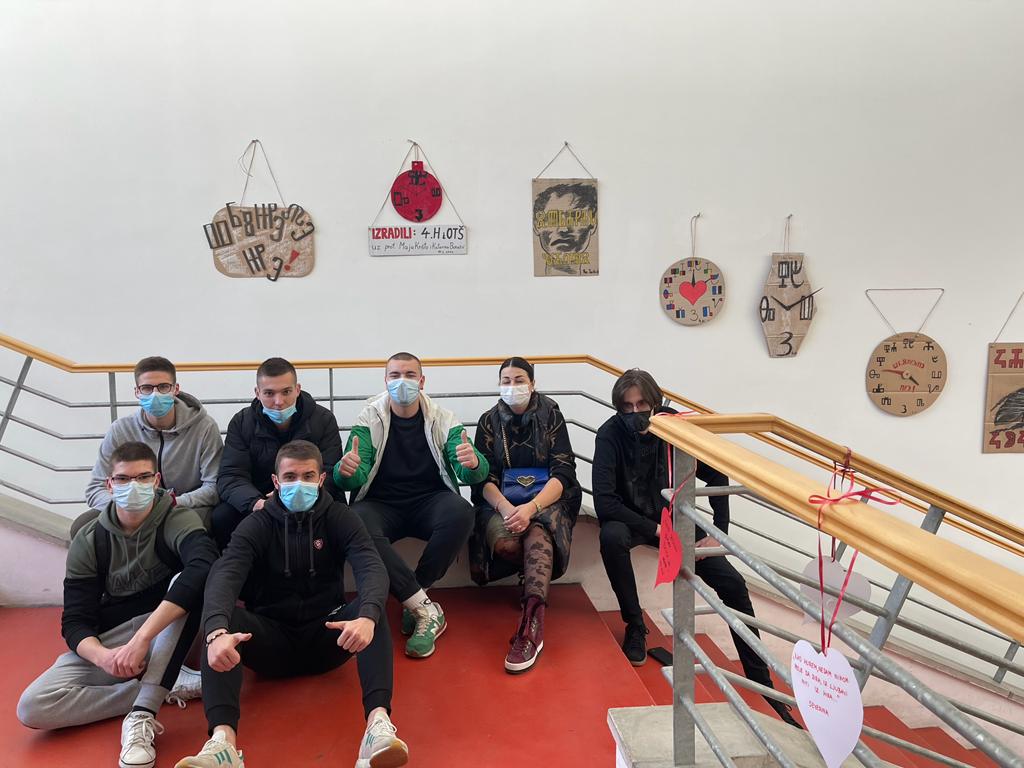Učenici su naslikali Kafkinog Kukca koji simbolizira dehumanizaciju čovjeka te su na taj način progovorili o vremenu pandemije koja nam je nametnula nadrealnu stvarnost, dok su na drugoj slici ugljenim bojama su prikazali naslovnicu Camusovog romana Stranac kako bi ovom pandemijskom razdoblju u kojem živimo, istaknuli otuđenost čovjeka našeg vremena i na taj način spojili književnost, pismo, i likovnu umjetnost. Svi naslovi i natpisi su pisani glagoljicom, a simboličan naziv teme “Vrijeme je!” bi bila svojevrsna poruka da je vrijeme okrenuti se jedni drugima te prihvatiti ljepotu života bez obzira na okolnosti, o čemu je bilo govora i na predavanjima. Hrvatska glagoljica je povijesno hrvatsko pismo, nezaobilazni simbol nacionalnog identiteta i višestoljetne uljudbe, na temelju kojega smo i danas prepoznati i jedinstveni u Europi, stoga je ovim putem njegujemo kao nematerijalnu kulturnu baštinu. Učenici su ovim putem razvijali vještine vrednovanja, samovrednovanja te vještine (samo)prezentacije. Kroz ovaj projekt se ostvarila suradnja s učenika sa svojim vršnjacima te su se kroz provedbu zadatka razvijale suradničke i komunikacijske vještine. Cilj ove aktivnosti je skrenuti pozornost učenicima i svim govornicima hrvatskog jezika kako je važno promicanje vrijednosti i ljepota hrvatskoga glagoljičnoga pisma, kako bismo time očuvali baštinu te osjetili pripadnost kroz vlastiti identitet i kako ne bismo zaboravili svoje pisane korijene. Cilj je bio spojiti pisanu riječ na glagoljici (nastavu hrvatskog jezika), uz korelaciju likovne umjetnosti, kako bi se prikazala dimenzija međupredmetnog doticaja tema i suradnje s kolegama. Izložba je otvorena za javnost od 10.2. do 18.2.2022.