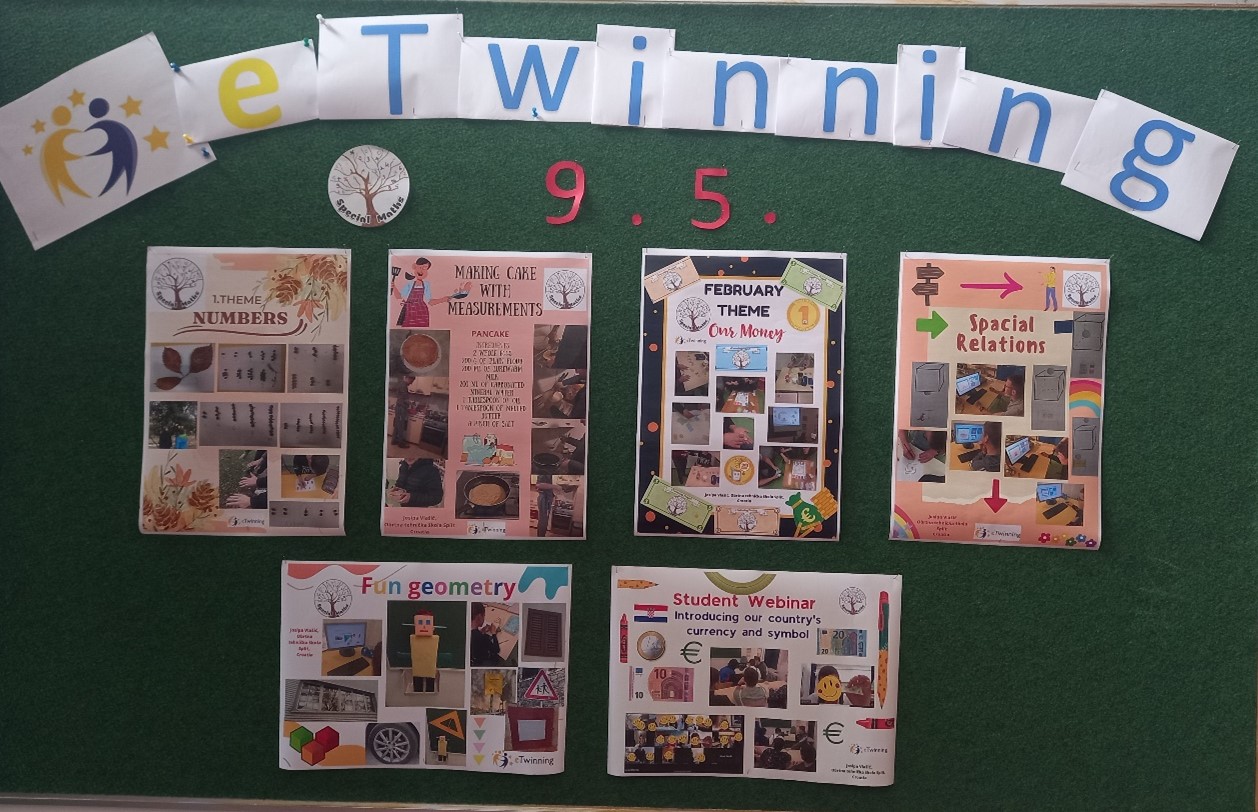 Danas, 9.5. obilježava se Dan eTwinninga, najveće europske zajednice odgojno-obrazovnih djelatnika predškolskih ustanova, osnovnih i srednjih škola. Naša škola dan prigodno obilježava malom izložbom u atriju škole u kojoj je predstavljen projekt Special maths u kojem sudjeluju učenici 1.i, 2.i i 3.i razreda zajedno s njihovom profesoricom matematike Josipom Vlašić. Učenici su u projektu od studenog 2022.godine zajedno s 67 učenika i 19 profesora iz 9 različitih zemalja. Više o samom projektu možete pročitati na: http://specialmathsprojects.blogspot.com