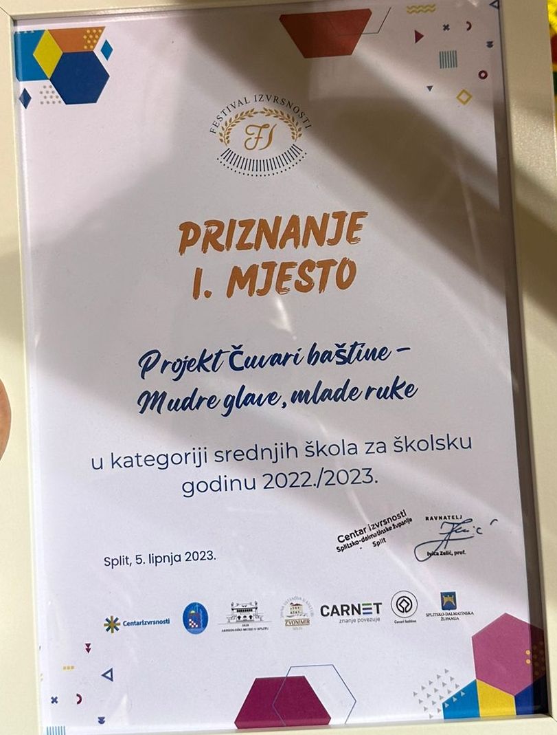 U utorak 6. lipnja 2023. učenici i nastavnici iz projektnog tima sudjelovali su na Festivalu izvrsnosti CI SDŽ u projekom koji je trajao jednu školsku godinu naziva “Izrada drvenih tradicijskih igračaka” i OSVOJILI SU 1. MJESTO u kategoriji srednjih škola za 2022./2023. u sklopu projekta Čuvari baštine; “ Mude glave, mlade ruke”. Učenici Obrtne tehničke škole Split su revitalizirali stare zelovske igračke koje su zadnji put rađene davne 2002. godine. Njih je izvorno izrađivala obitelj Jakova Delaša iz Dalmatinske zagore.Radi se o 5 motiva igračaka rađenih od drva, a to su: “tica” klepetuša, jednopreg zvani “kar”, čekić zvani “svirac”, plesači zvani “ vrtaljika” i avion. Video prilog na HRT - https://fb.watch/l3g7vbAJf1/