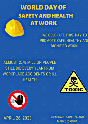 Tijkom tjedna u našoj školi smo povodom Svjetskog dana sigurnosti i zaštite zdravlja na radu održali niz prigodnih predavanja, izrađivali prezentacije, plakate i digitalne plakate ... Dio plakata smo izložili na panou u školskom holu, a više možete vidjeti u ovoj galeriji i na naslovnici pod istim nazivom. Svjetski dan sigurnosti se u svijetu obilježava 28. travnja.