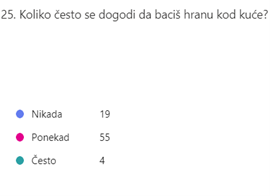 Zabrinjavajuće je da 24% ispitanika ne podržava oblik ovakve donacije. Na upit kako smanjiti bacanje hrane dobili smo niz izvrsnih odgovora: podijelio bih obroke sa drugim ljudima, kupovao manje količine namirnica da ih stignemo sve utrošiti, višak hrane spremimo u hladnjak i pojedemo sutradan, hranu dati životinjama…