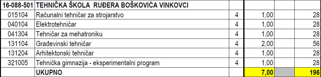 - 44 boda za upis u ostale programe (elektrotehnilar, tehičar za mehatroniku, građevinski tehničar i arhitektonski tehničar)