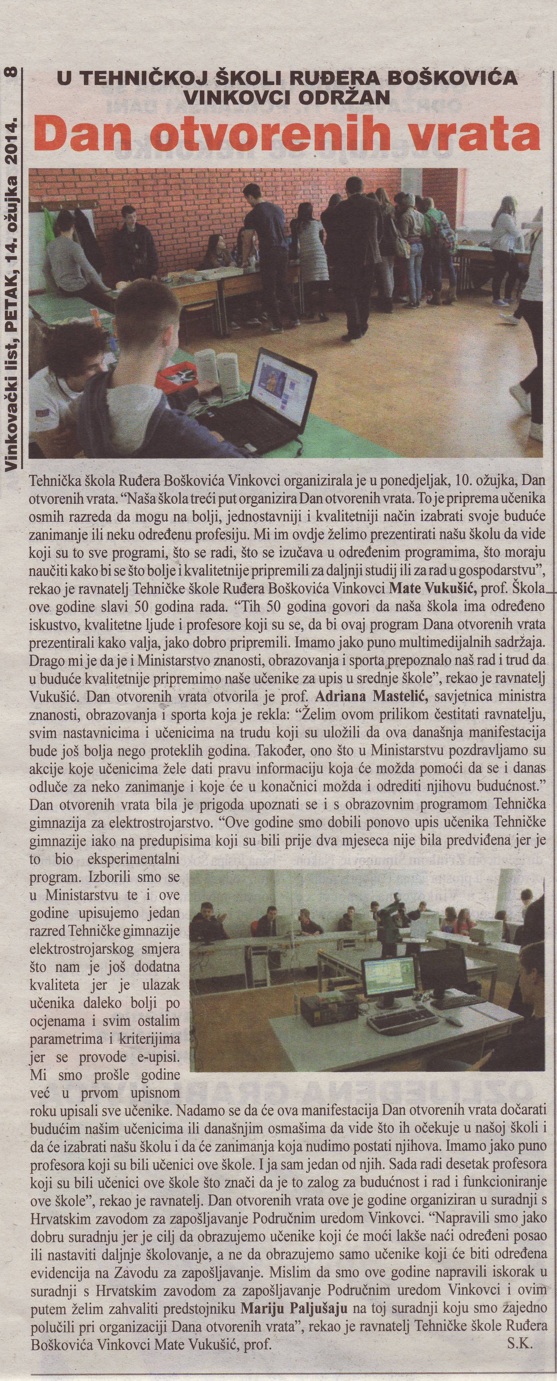 Evo kako su lokalni mediji popratili manifestaciju Dana otvorenih vrata u našoj školi. Pogledajte isječak iz Dnevnika VTV-a i pročitajte članak objavljen u Vinkovačkom listu.