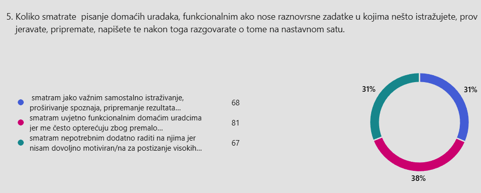 Svjesnost o važnosti domaće zadaće u smislu učenja odgovornostima i razvojem navike učenja ima samo 29% ispitanika, dok 44% misli da im služi samo za odgađanje obveze učenja. 28% se ipak odlučilo da ih domaća zadaća uvjetno „ prisili“ na dosjećanje onoga što su u školi učili.Promišljanja ispitanika o funkcionalnosti samostalnog istraživanja, pripremanja i pisanja kod kuće nakon čega na nastavnom satu provjeravaju svoje spoznaje i zaključke smatraju jako važnim 31%, uvjetno funkcionalnim 38% dok je slabije motivirano 31% koji ne žele dodatni rad.