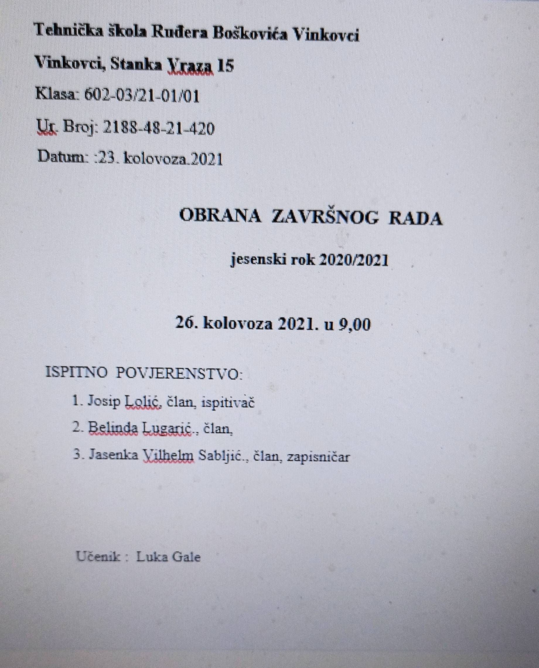 RASPORED OBRANE ZAVRŠNOG RADA jesenski rok 2020/2021.