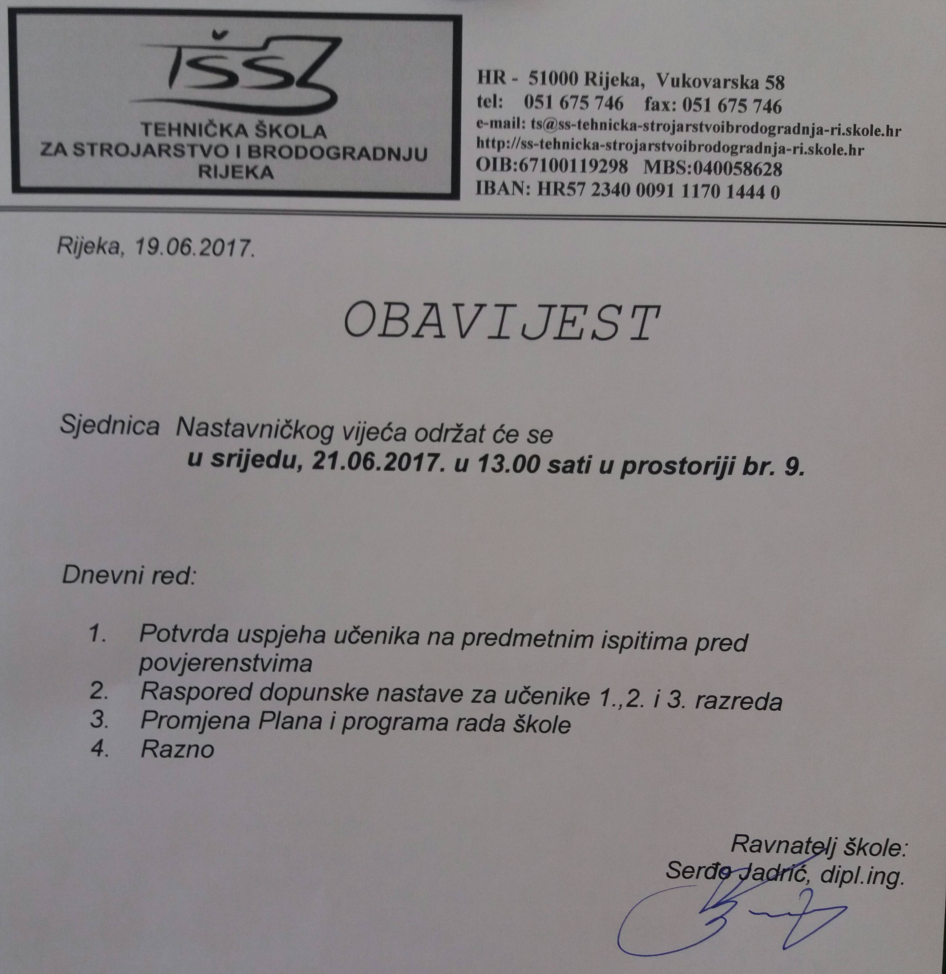 Sjednica Nastavničkog vijeća održat će se u srijedu, 21.06.2017. u 13.00 sati u prostoriji br. 9.